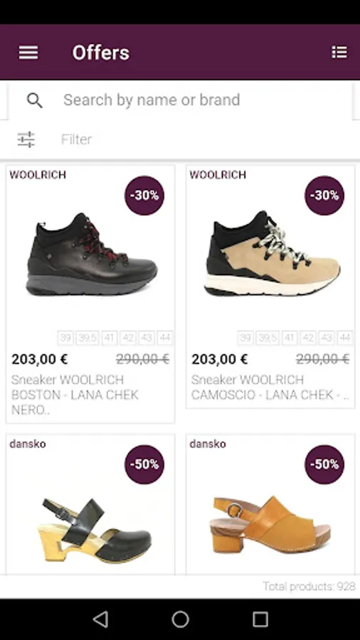 It presents a complete catalog of products available in our warehouse, shoes, bags, clothes, of the best brands. It allows you to save at least 10% on each product. You will be informed about the latest offers, promotions and events. Catalog has been organized comfortably, allows you to filter products by sizes, brands, categories. You can also buy from the comfort of your home, with fast shipments, or if you prefer to collect the goods directly in the store.