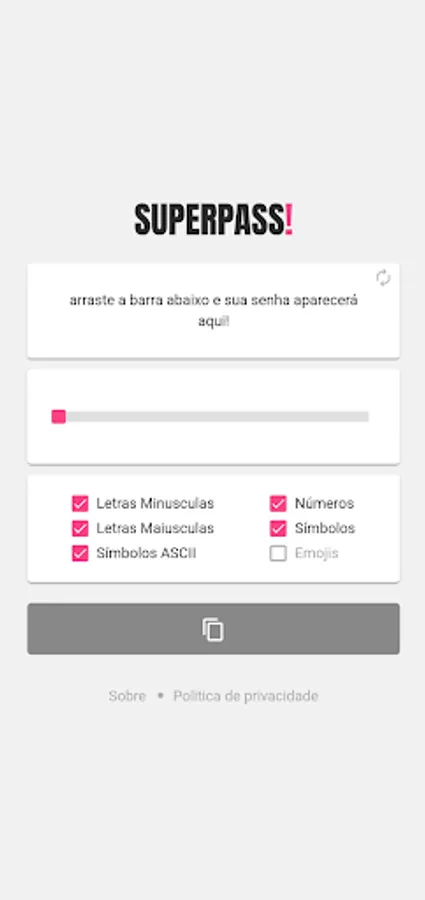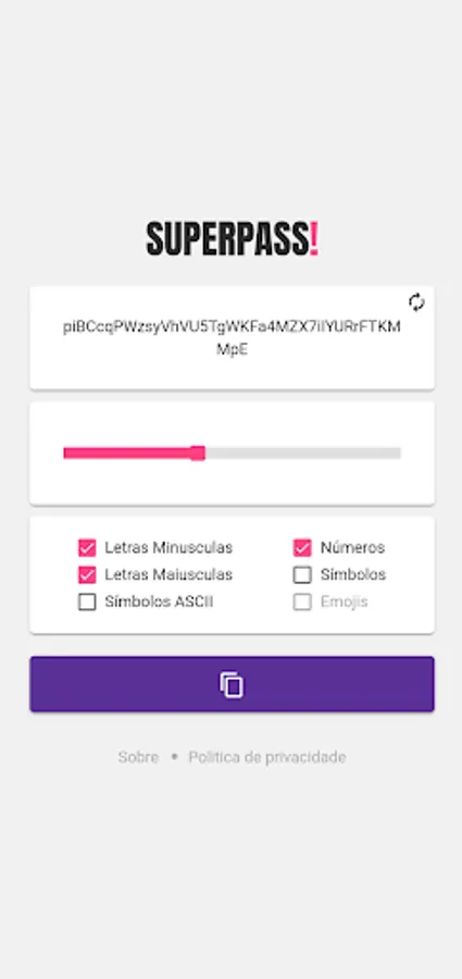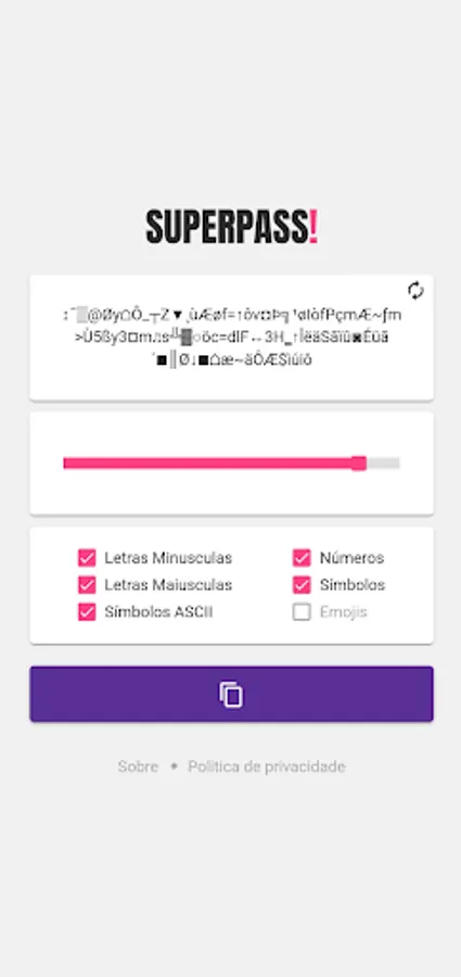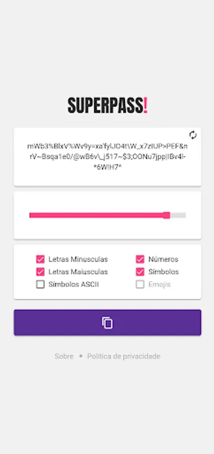 With SuperPass you will be able to create passwords with various types of characters, from alphanumeric to ASCII symbols with extreme security, without any data collection!