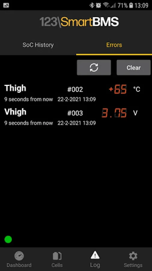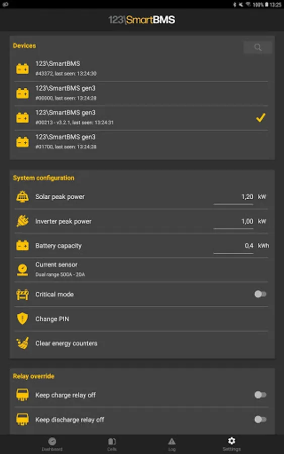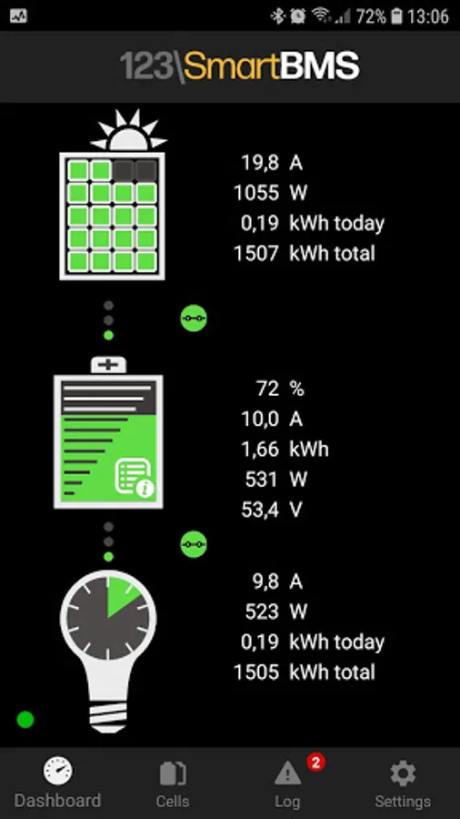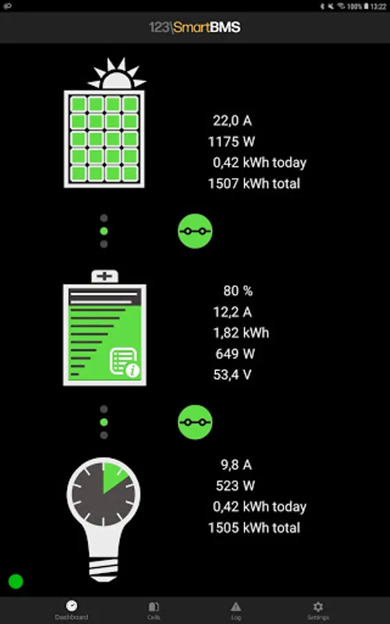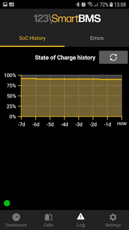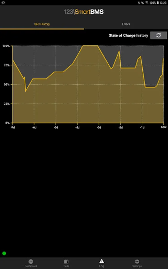 Easily connect your phone to the BMS to see relevant information including state of charge, energy consumed, energy stored, in- and outgoing current, cell voltages, cell temperatures, SoC history of the last week and error history.