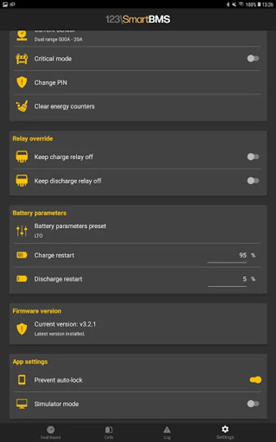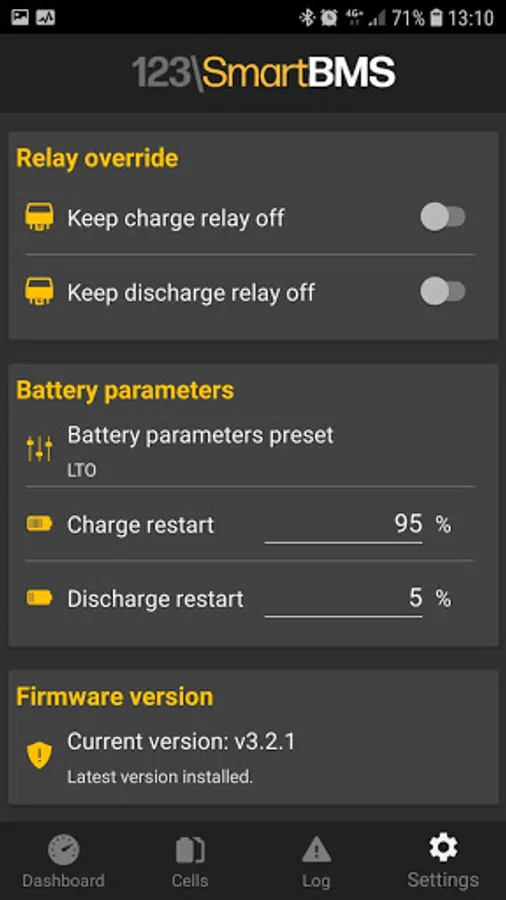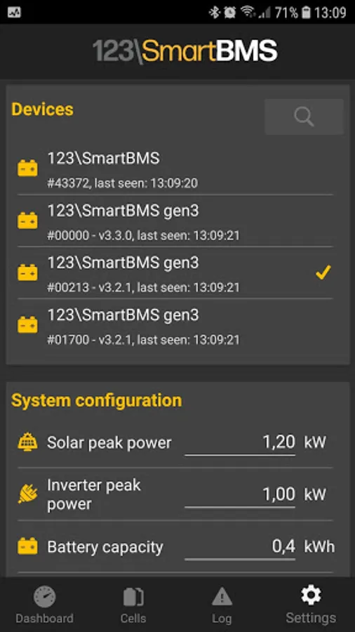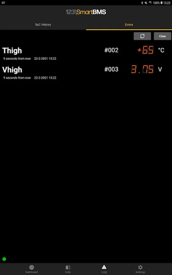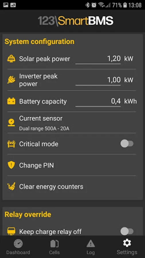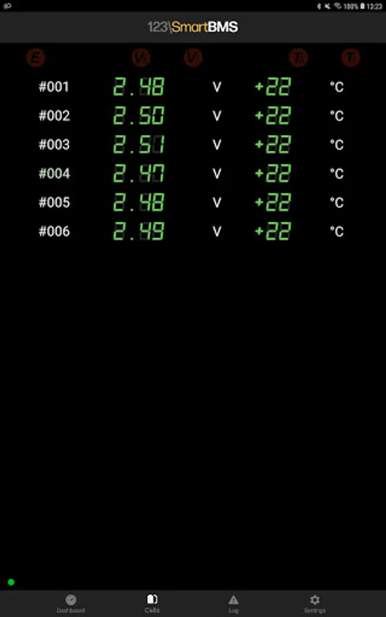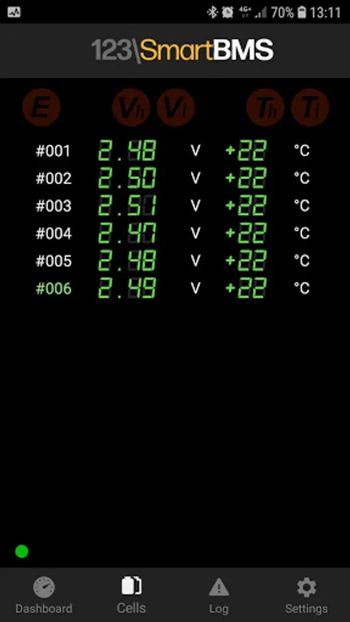 Easily connect your phone to the BMS to see relevant information including state of charge, energy consumed, energy stored, in- and outgoing current, cell voltages, cell temperatures, SoC history of the last week and error history.
