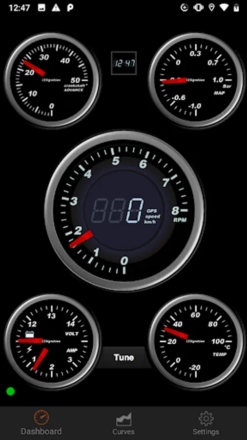 Now, with the engine running, your phone or tablet can be used to 'TUNE'......one can see the engine-speed, the generated advance, the time, the temperature of the distributor, battery-voltage, spark-energy, vacuum/boost, and...(provided your device is equipped with a GPS-module) the speed of the car.