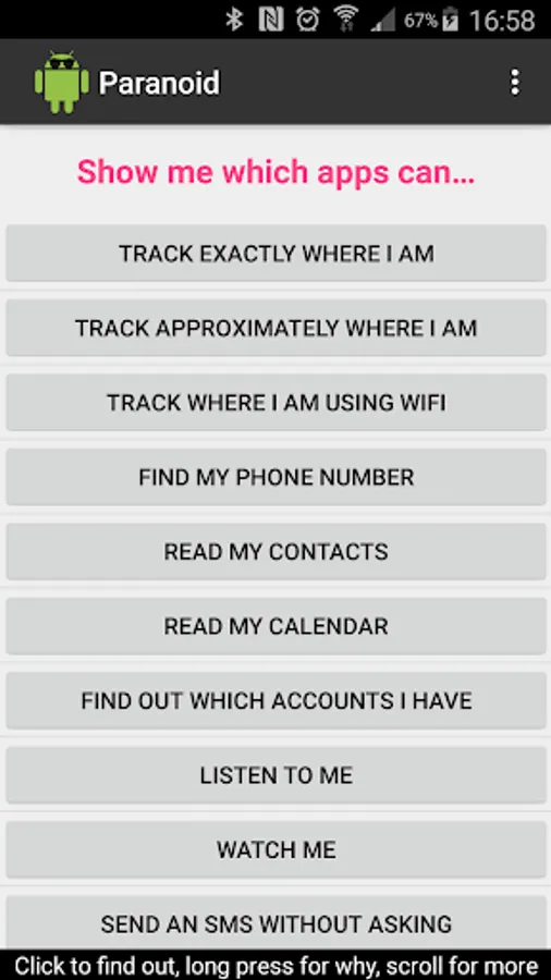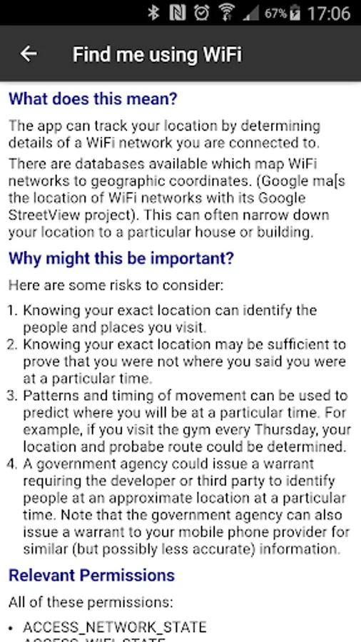 For example, an app which can determine your exact location is fine: an app that can determine your location and report it back to someone else using SMS or the internet is more risky. A well-known messaging app which also tracks your location and your phone calls for no valid reason is definitely questionable, as many people have only just discovered.
