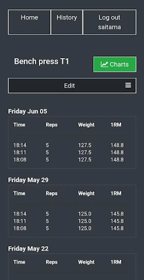 Use Fitty as a template for your workout routine and keep track of your progress. Visualize your progress in intuitive charts.