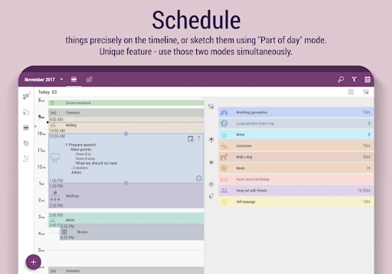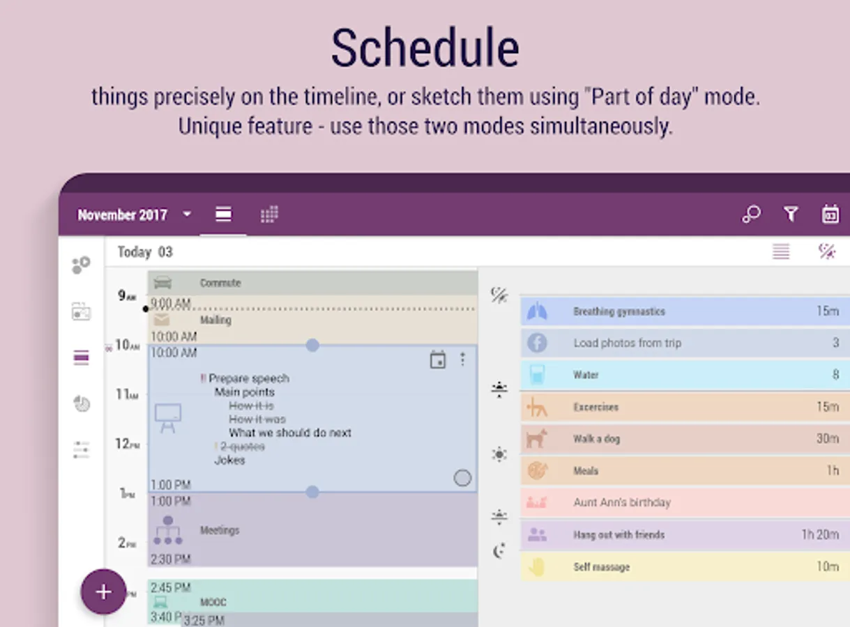 If you are tired of keeping lots of time management apps like calendars, to-do lists, habit trackers, timers, alarms, note pads, try Time Planner that has all those tools included. Save time and boost your productivity in different areas of life!