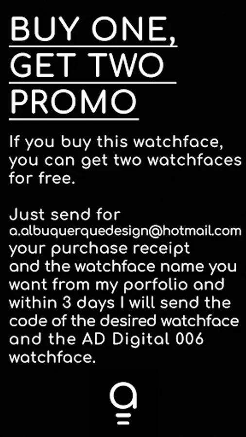 If you buy this watchface, you can get two watchfaces for free. Just send me an email with your purchase receipt and the name of a desired watchface from my portfolio, and within 3 days, I will send you the code for the desired watchface and the AD Digital 006 watchface.