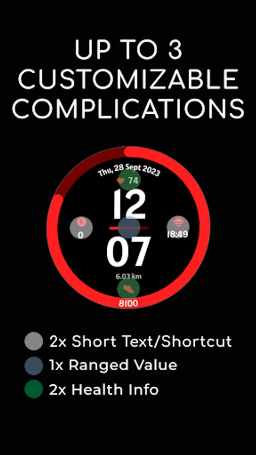- Fixed health information such as heart rate, number of steps and distance walked during the day (in kilometers or miles depending on your language/location);
