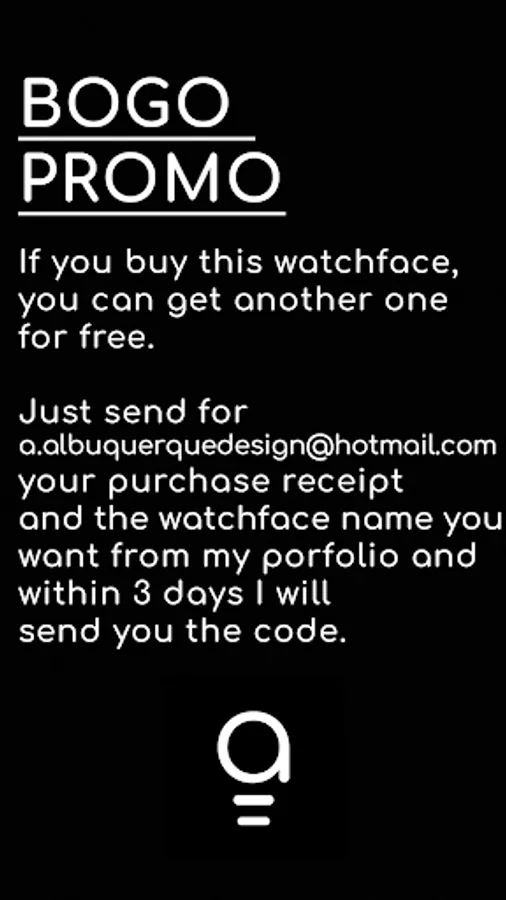 If you buy this watchface, you can get another one for free. Just send me an email with your purchase receipt and the name of the desired watchface from my portfolio, within 3 days I will send you the desired watchface code.