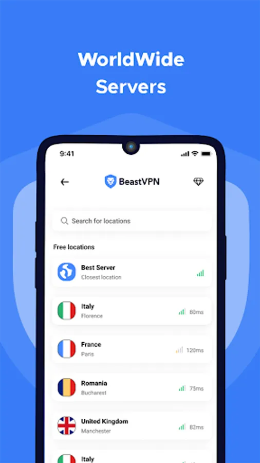Looking for an easy VPN? Well with BeastVPN you will connect to a secure VPN connection with one tap. Pick the server country of your desire and use the VPN connect button to connect/disconnect. It’s that simple with our unlimited VPN gaming app.