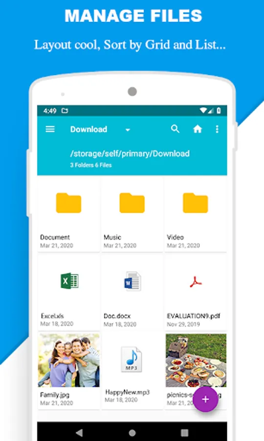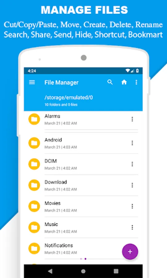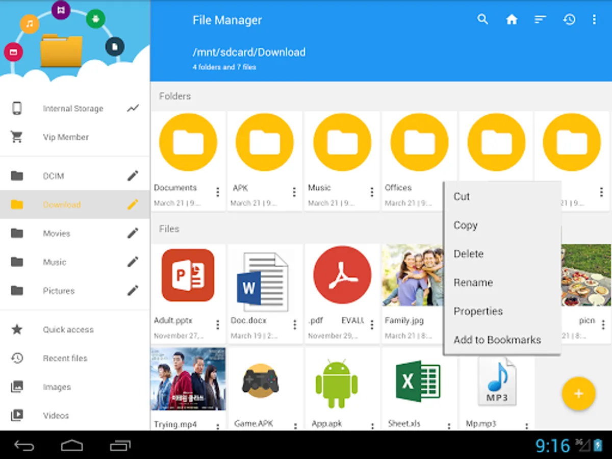 Manage your files (file explorer) like you do on your desktop or laptop using Multiple Select, Cut/Copy/Paste, Move, Create, Delete, Rename, Search, Share, Send, Hide, Create Shortcut, and Bookmark;