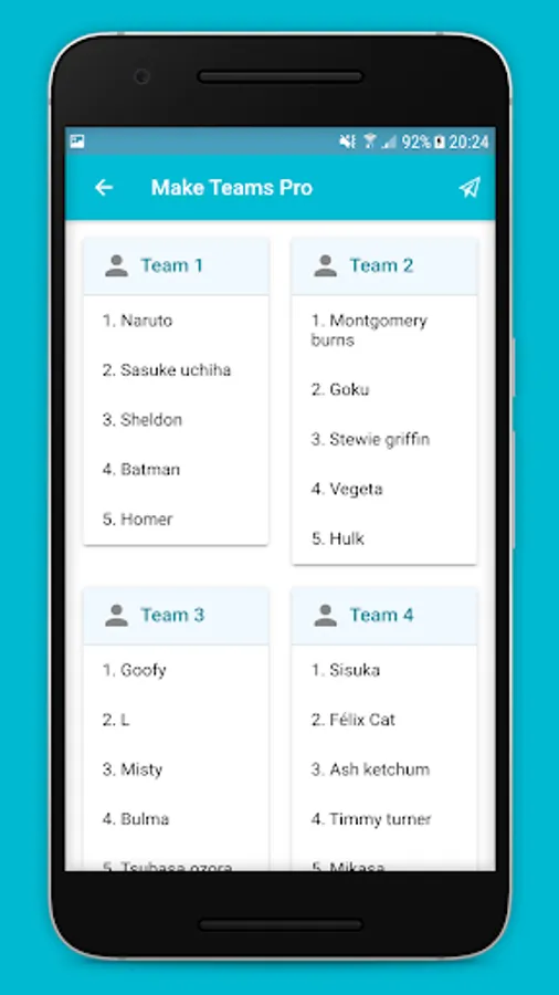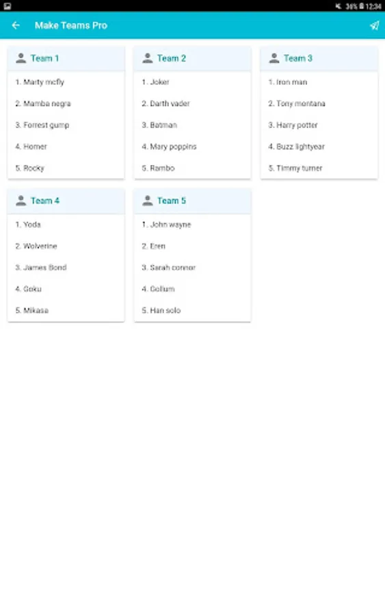 You can share the resulting teams quickly 📡 from the "share" button that appears at the top of the "Generated teams" screen (by whatsapp, email 📧, etc.).