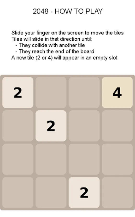 Swipe to move the tiles. Tiles will slide until they collide with another or reach the end of the board.
