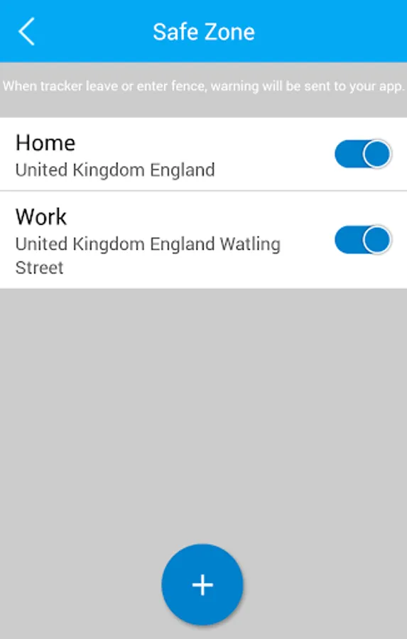 - Safe Zone: Draw safe zones and get alerted if a tracker has entered or exited an area.