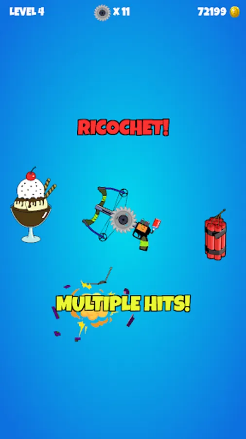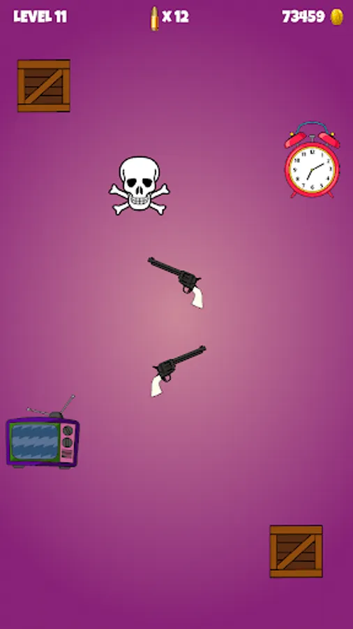 Destroy targets (tomato, treasure chest, crate, toolbox, ice cream, dynamite and tnt explosive...) using direct hits or ricochet bullets.