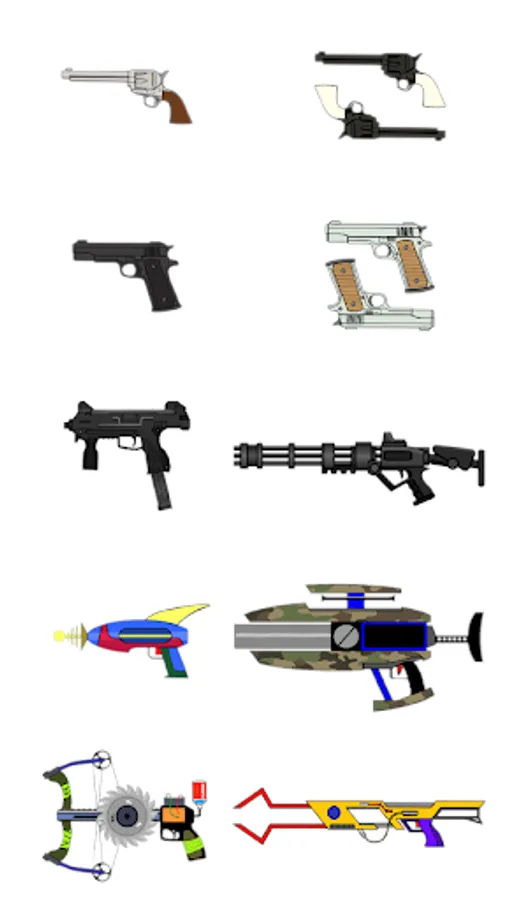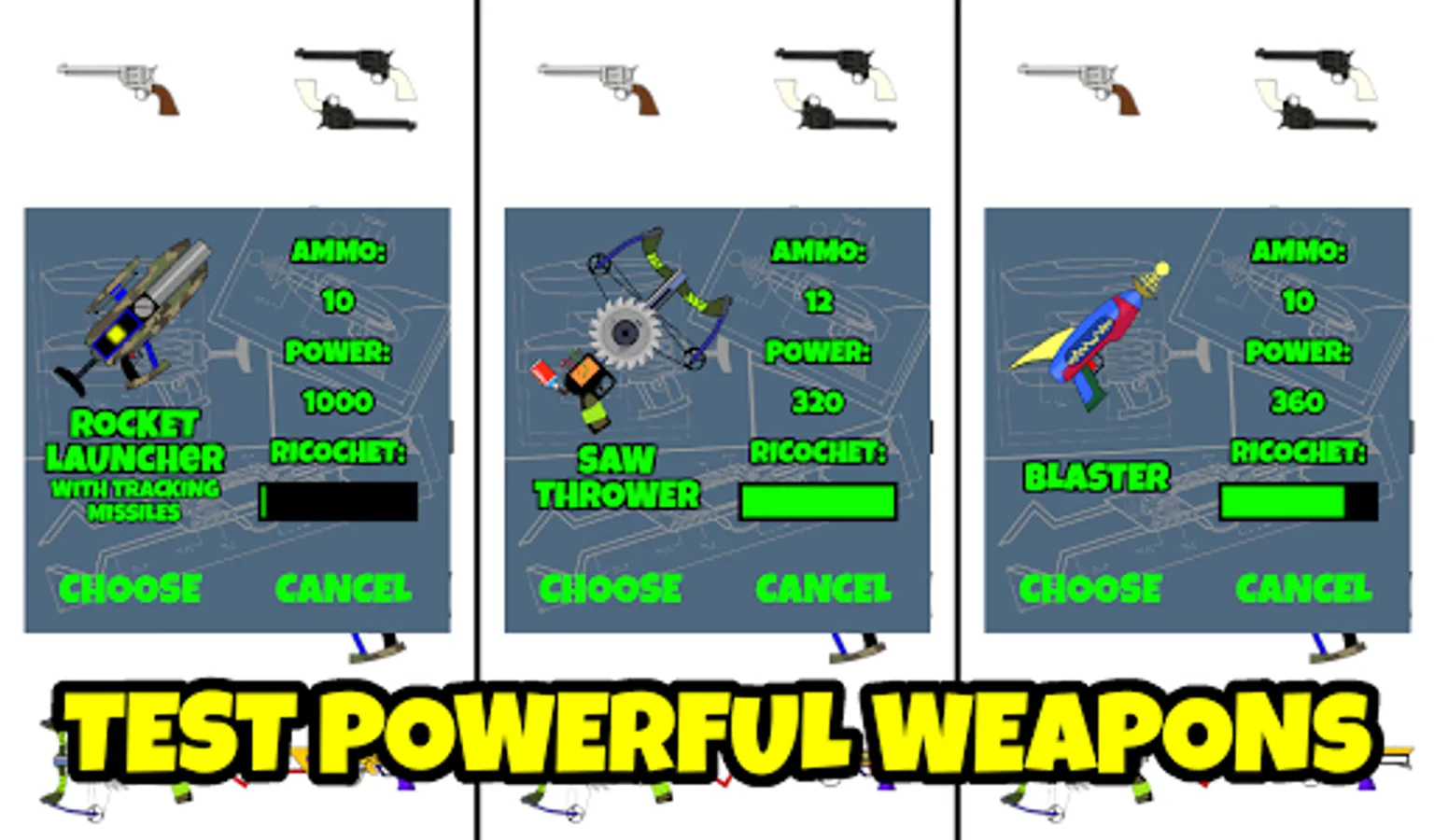 Try different types of flippy weapons - old wild west six shooter revolver, beretta pistol, dual wielding revolvers and pistols, machine gun, minigun, rocket launcher, thunder gun, saw thrower and retro sci-fi blaster gun.