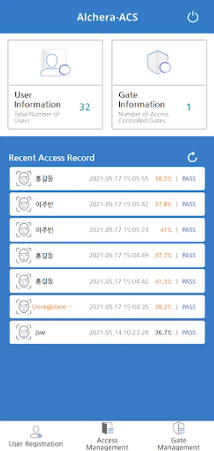 It is a mobile app for administrators that enables user management, gate management and access history check through connection with Alchera-ACS Gate, a non-face-to-face & face recognition heating check system.