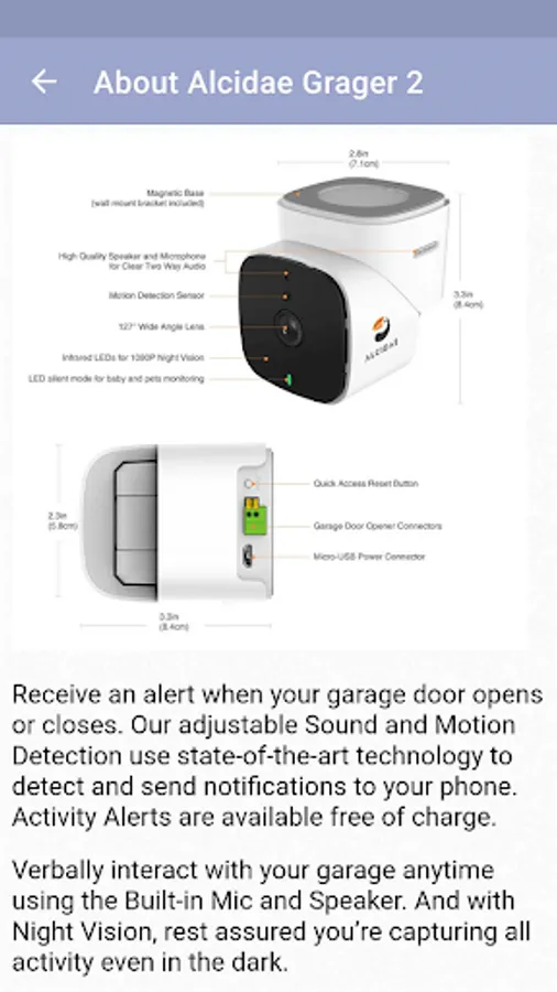 Alcidae Garager-2 helps keep you safe by monitoring the entrance and exit of your home. Don't worry if your garage door is left open with Garager 2, everything is under your watch. You can interact with your garage verbally at any time using the built-in microphone and speaker on your Alcidae camera. You will receive notifications when your garage door is opened or closed.