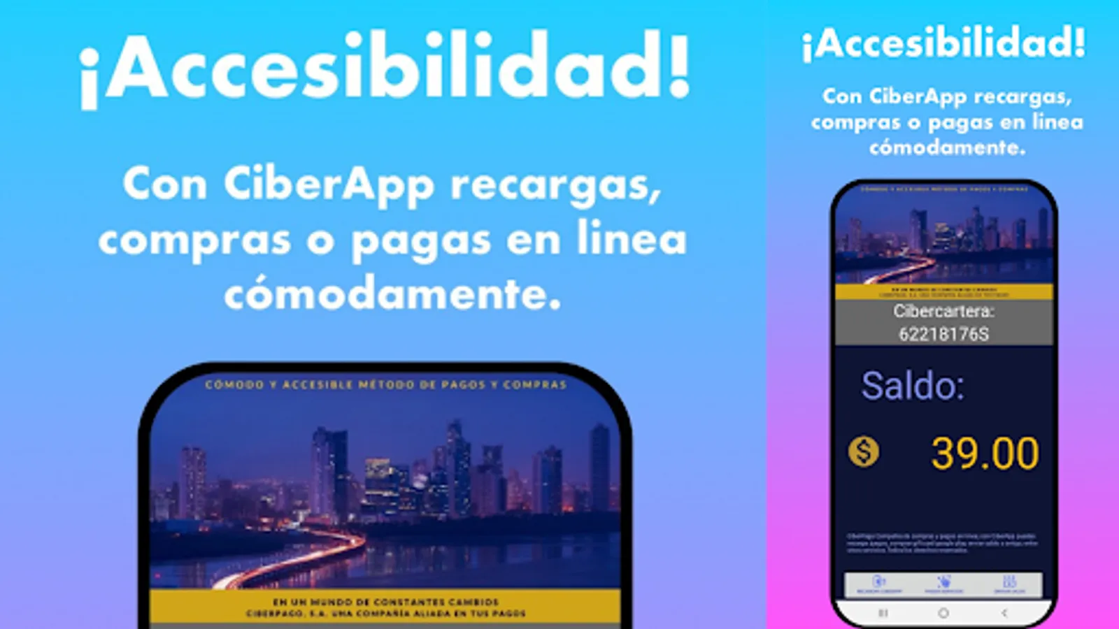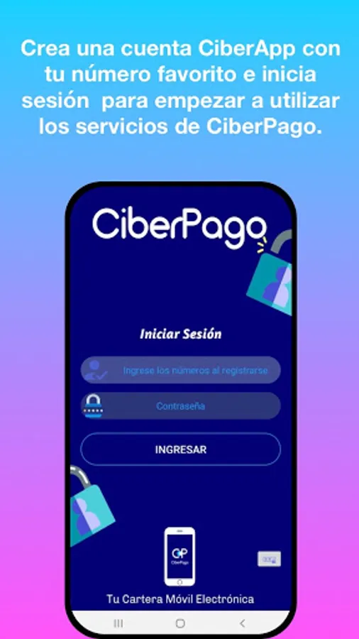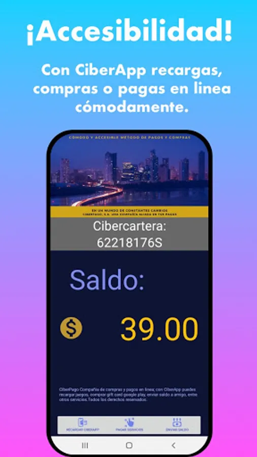 CiberApp works as a mobile electronic wallet system, through which you can pay or buy services 24 hours a day.