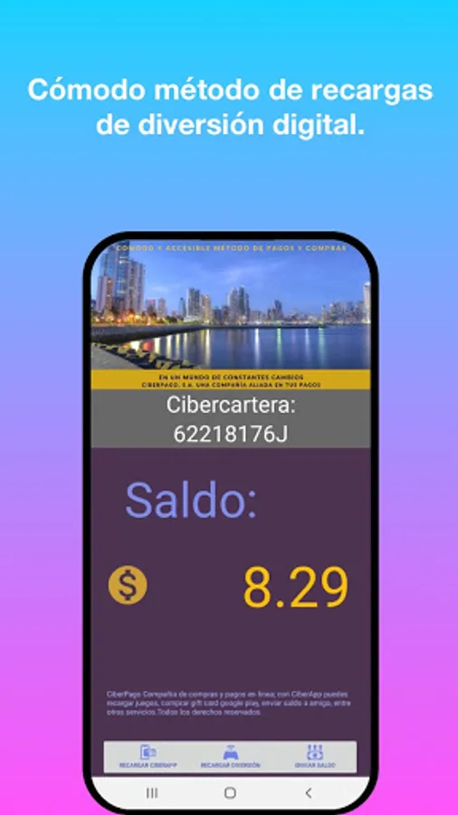 That's right! CiberApp gives you accessibility to recharge games, pay for basic services (electricity, water, telephone, internet, etc.); buy online, in commercial establishments affiliated with CiberPago.