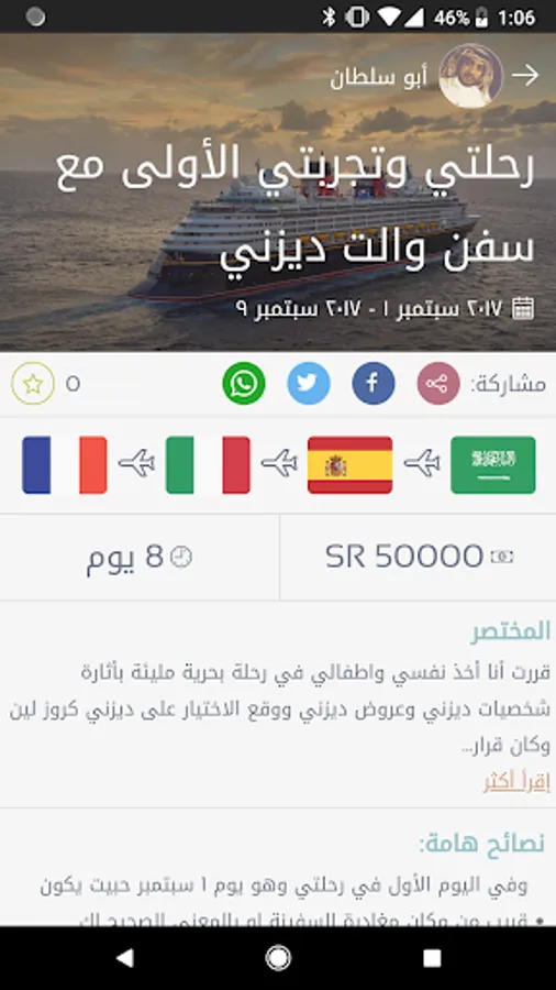 تطبيق المسافرون يسمح لك بتدوين جميع رحلاتك سواء الماضية او الحالية ومشاركتها مع الأخرين للإستفادة منها. كما أن التطبيق يسمح لك باستكشاف رحلات المسافرين الآخرين والاستفادة من تجاربهم الشخصية من ناحية تخطيط السفر والتكلفة والنصائح المهمة قبل السفر.