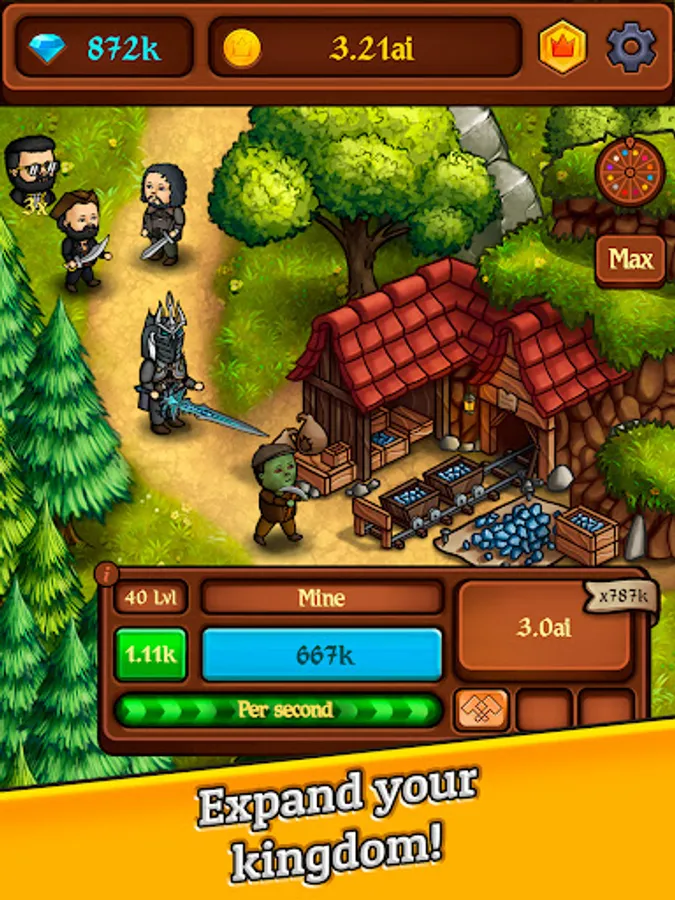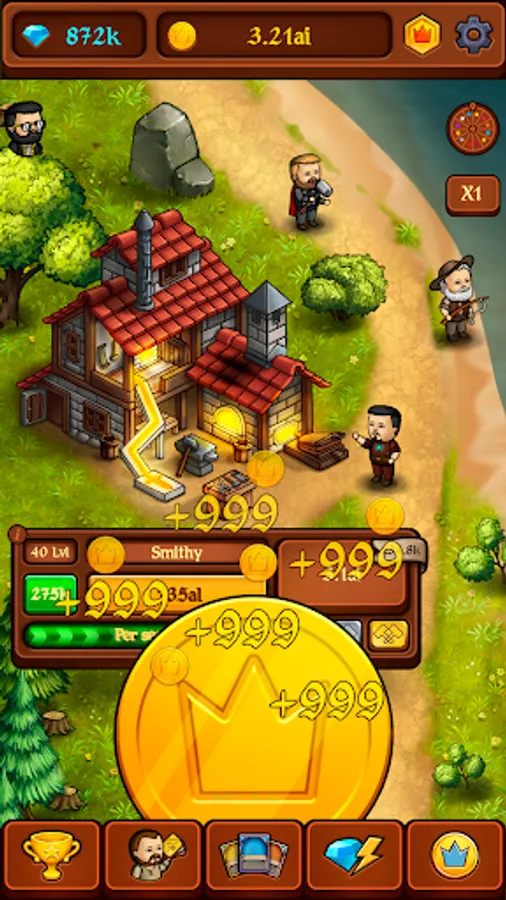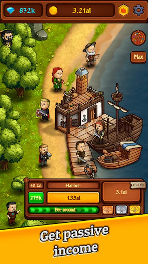 Invest earned gold coins and earn even more to buy more unique buildings and characters or even heroes !
