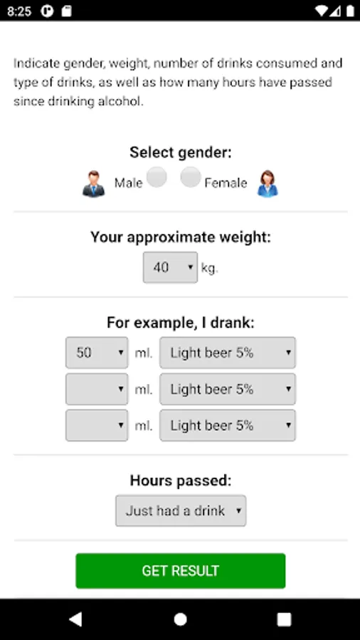 With this alcohol calculator you can independently determine the approximate blood alcohol content after drinking alcohol. In our opinion, this is the most accurate virtual breathalyzer among other online blood alcohol calculators for drivers found on the Internet.