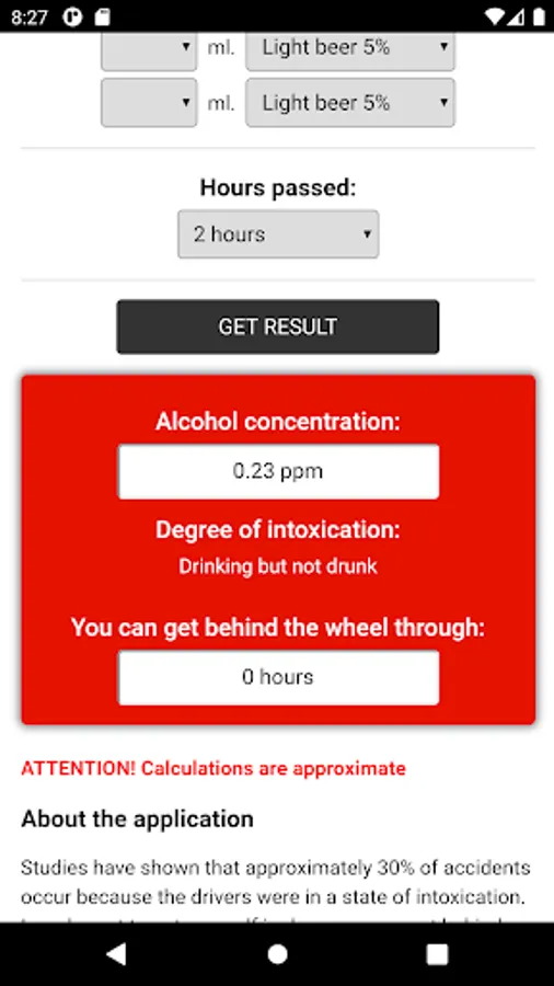 5. Then our alcohol calculator will calculate the estimated blood alcohol content, give you a "diagnosis" and write whether you can drive a car in this state.