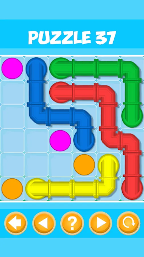 On the fifth screen you can start connecting. Link dots of the same color with a single pipe line, but make sure you create the pipe connection in a way that will not prevent connecting other dots with pipe lines as well. So don't let any connection cross another. The puzzle is solved when you complete connecting all matching color pairs. Well Done!