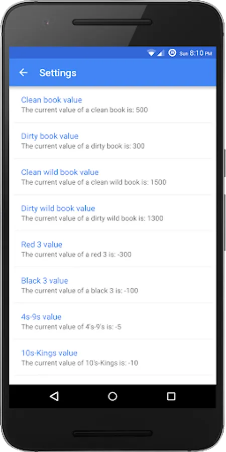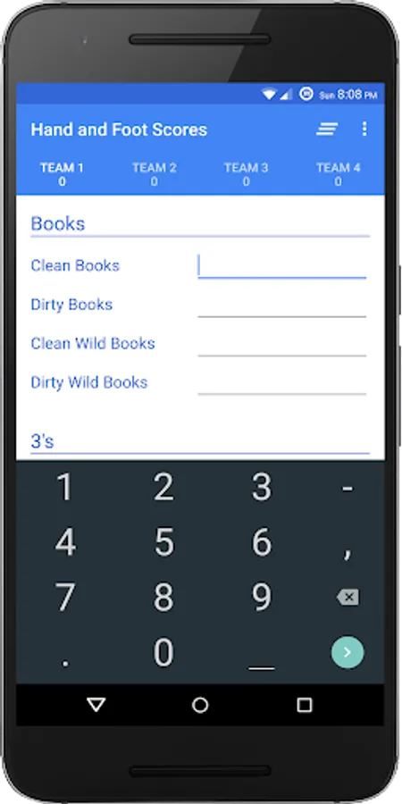 A material design score keeper for Hand and Foot. There are tabs for 4 different teams which can be easily accessed by swiping or tapping the tab at any time. All values are automatically calculated. Just enter the number of each item and scores are applied based on the score settings. The value of any of the items can be adjusted in the settings. A clear all button makes starting a new game easy.