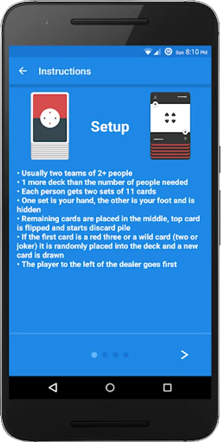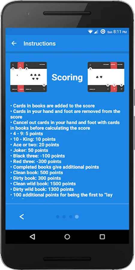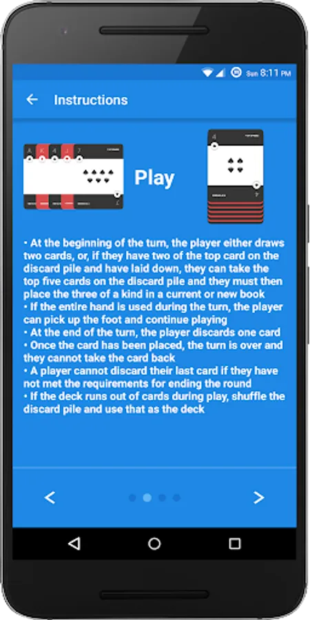 An instructional section is also included. Click on "Instructions" and swipe or tap through the instructional slides to learn how to play Hand and Foot.