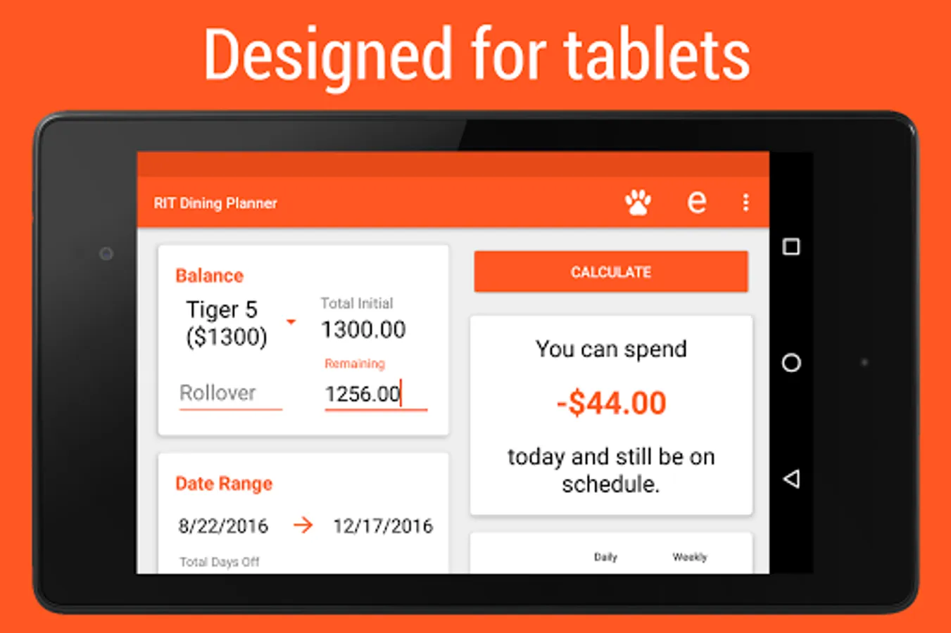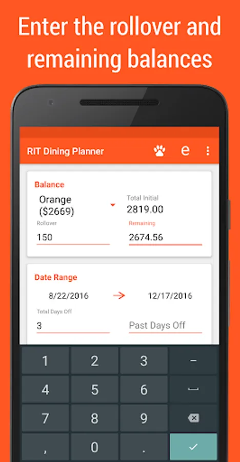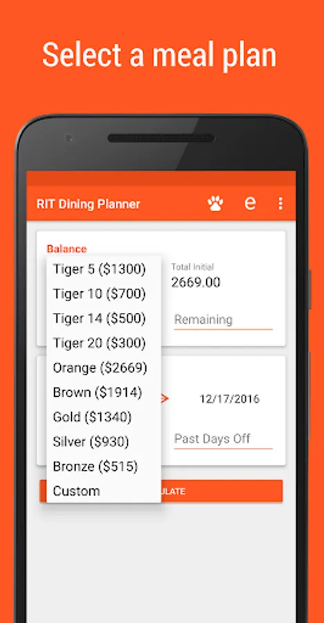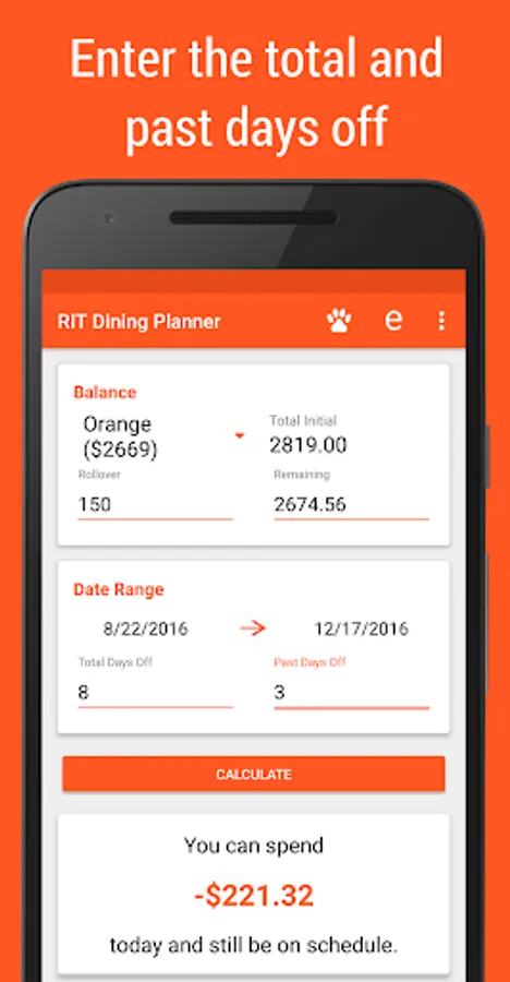Choose your meal plan and enter any rollover. Select the current term and fine tune the date if needed. Enter the current balance to get calculations for your current situation. Days off can be added for holidays.