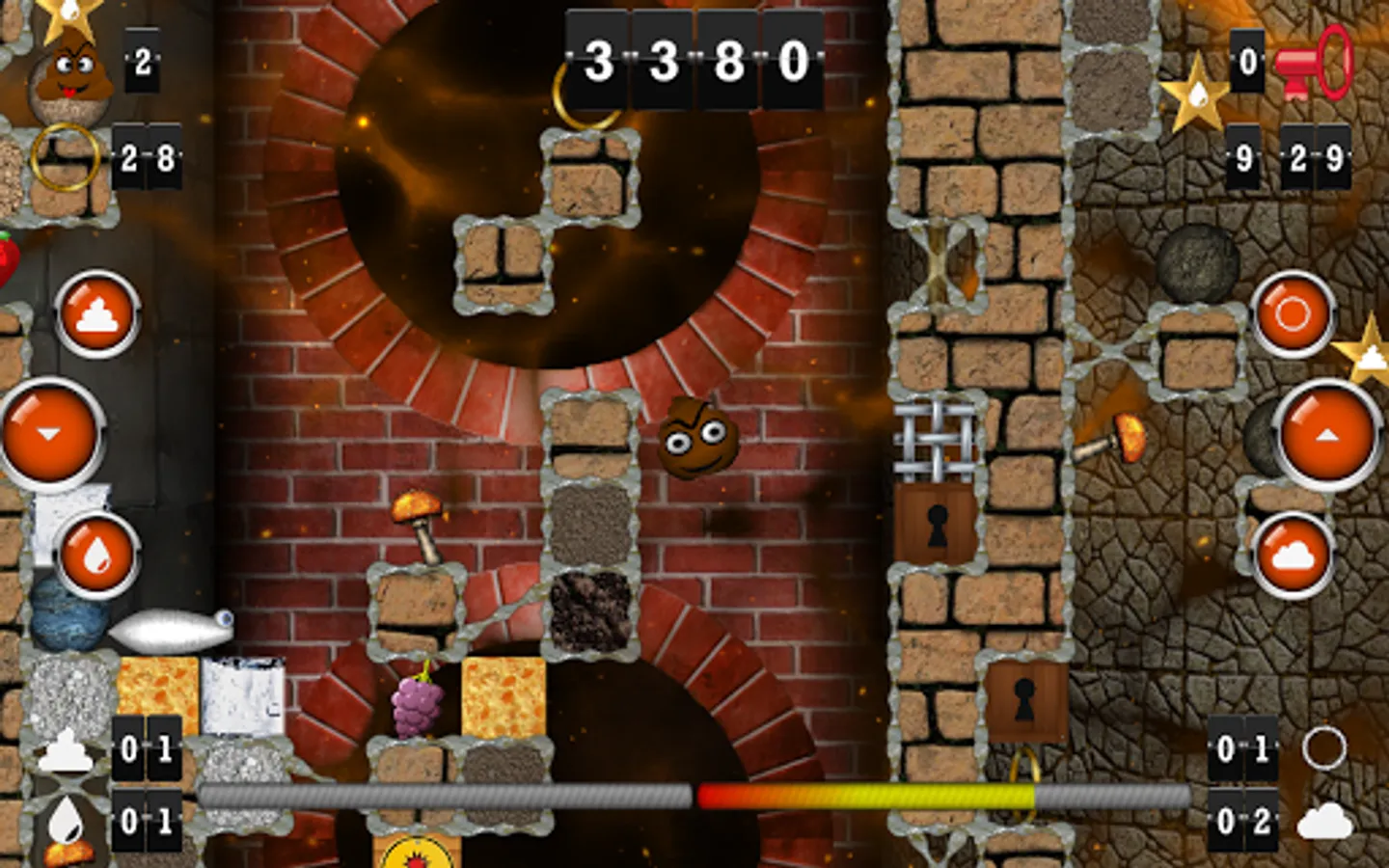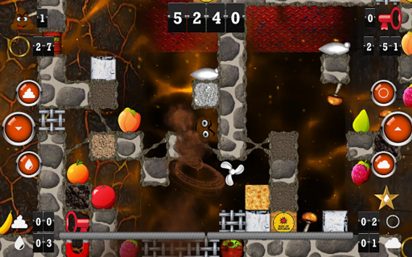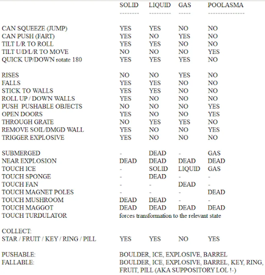 The different states have different properties, and are vulnerable or immune to the various objects in Turd World. The aim of each level is to collect all of the golden-brown rings and locate, and enter, the exit-hole.
