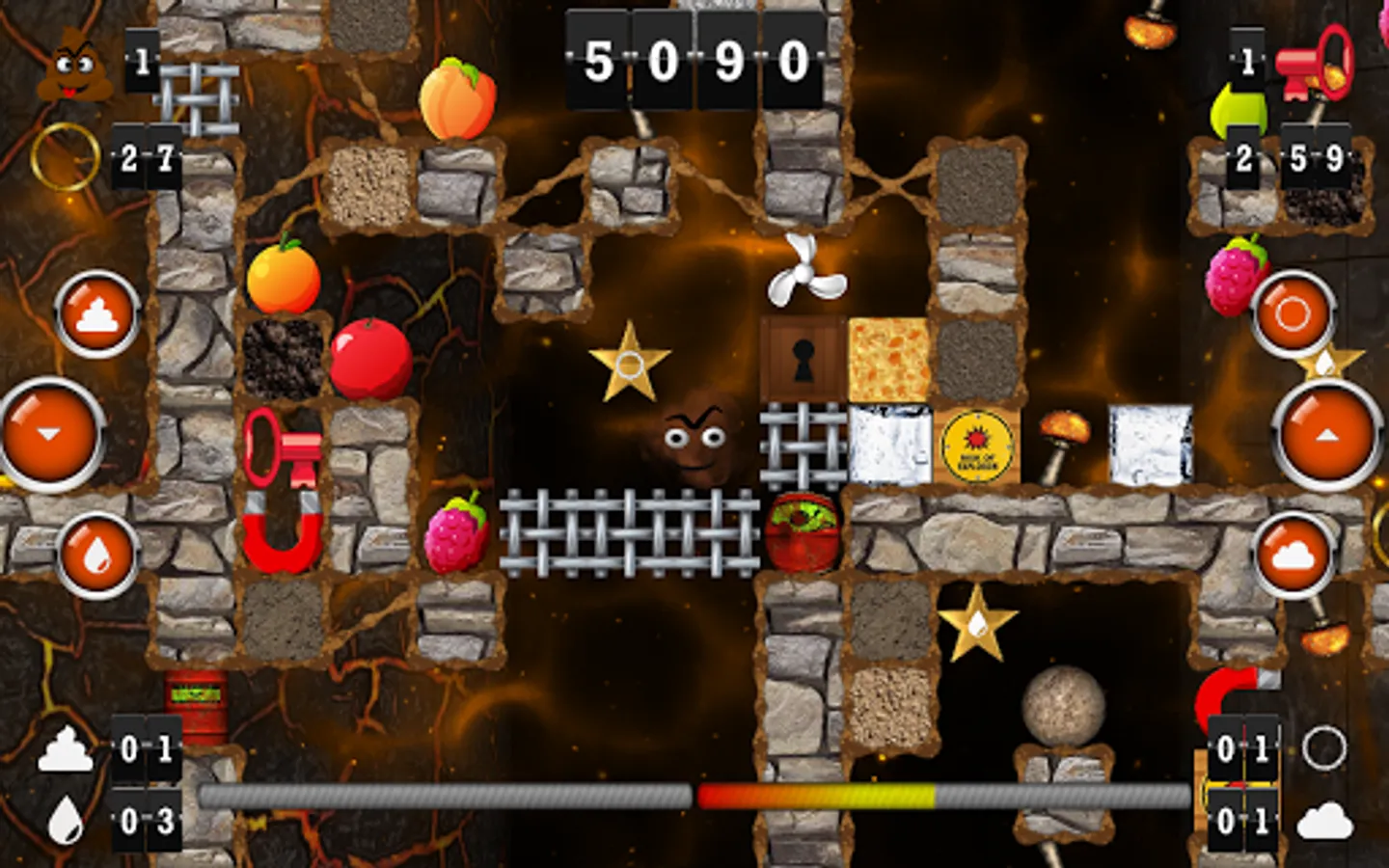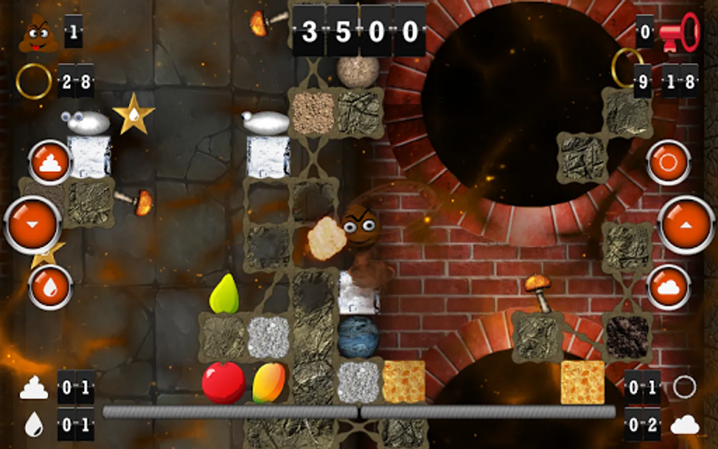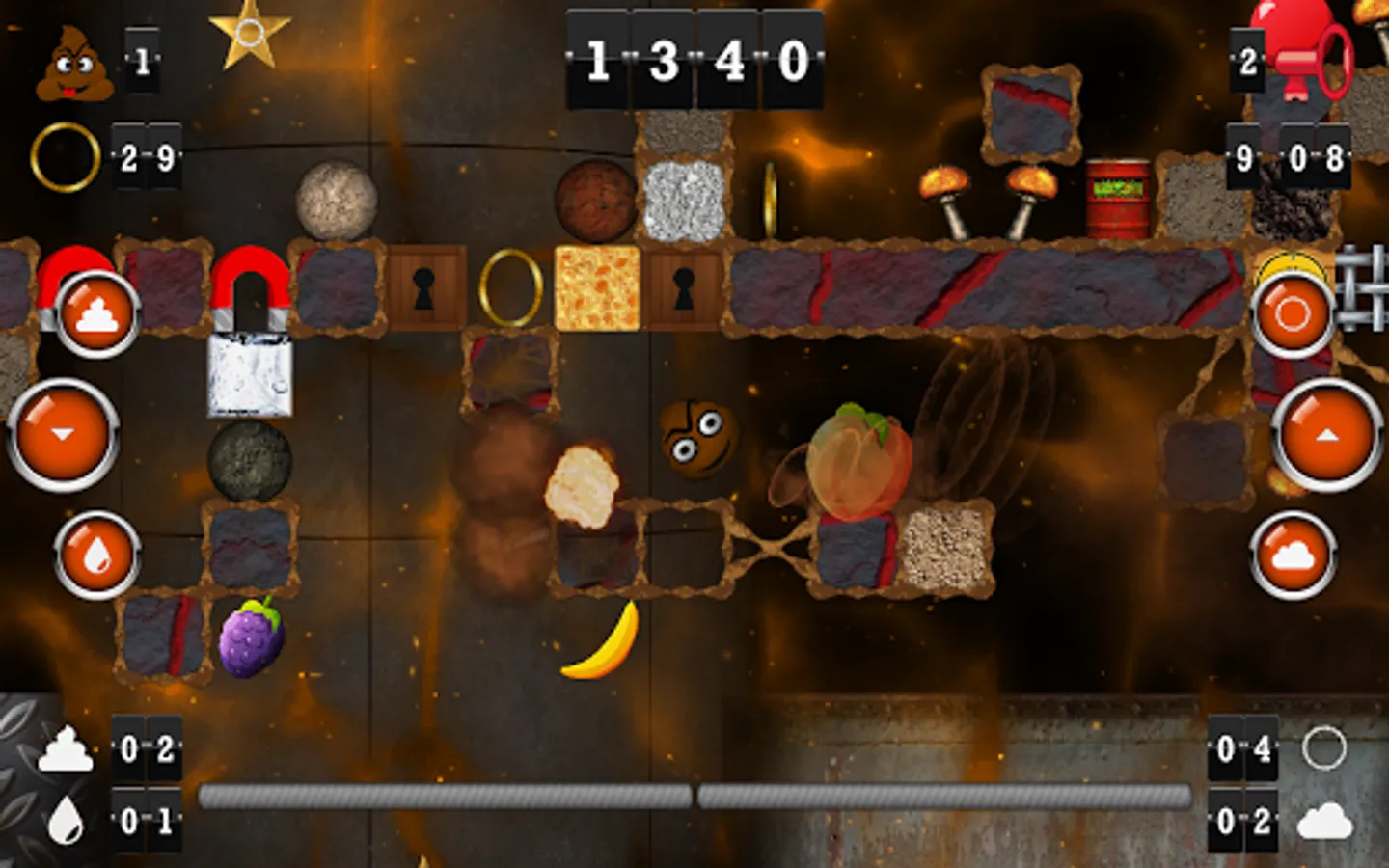 The different states have different properties, and are vulnerable or immune to the various objects in Turd World. The aim of each level is to collect all of the golden-brown rings and locate, and enter, the exit-hole.