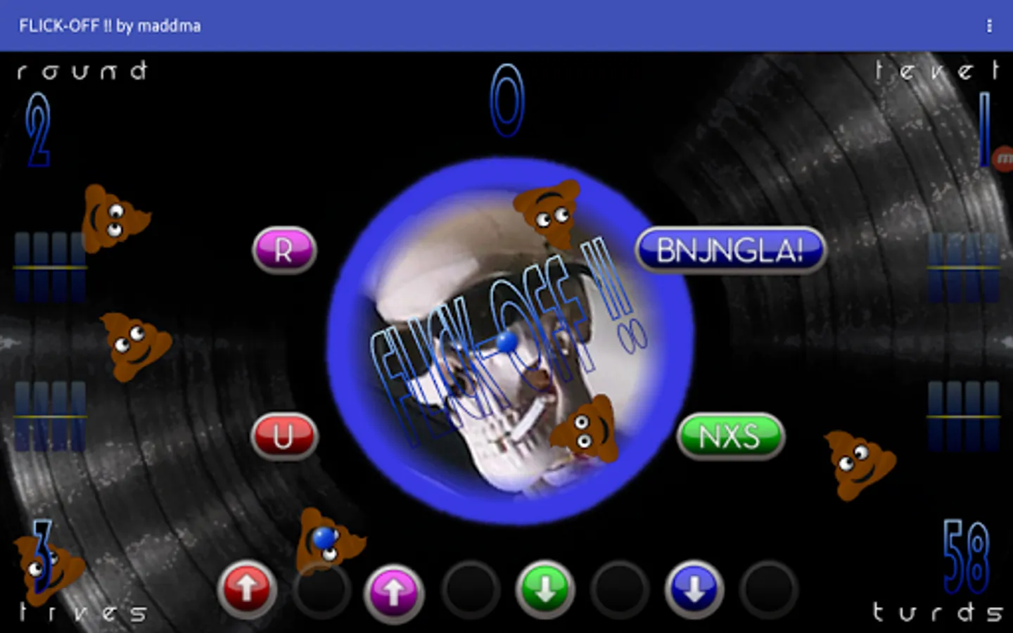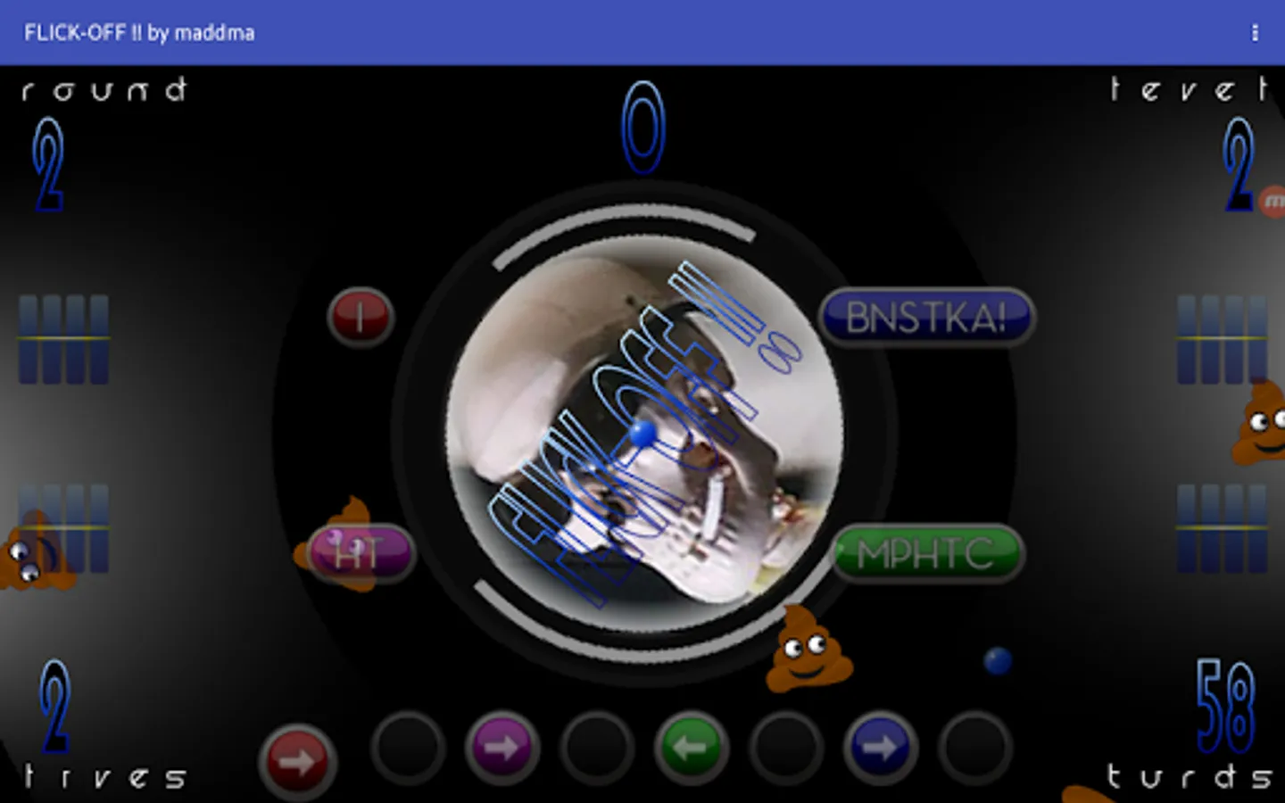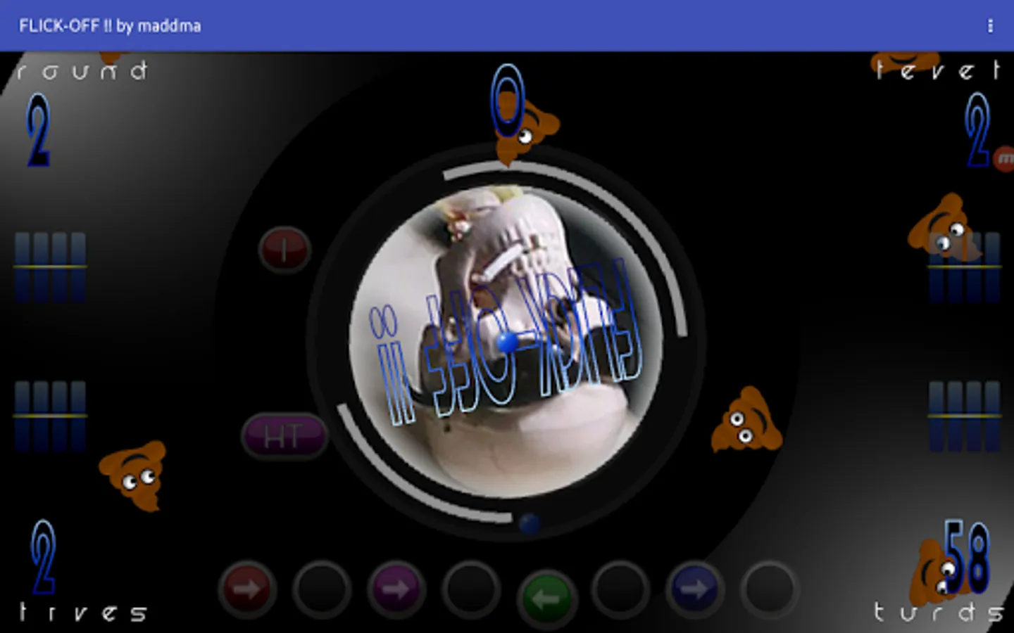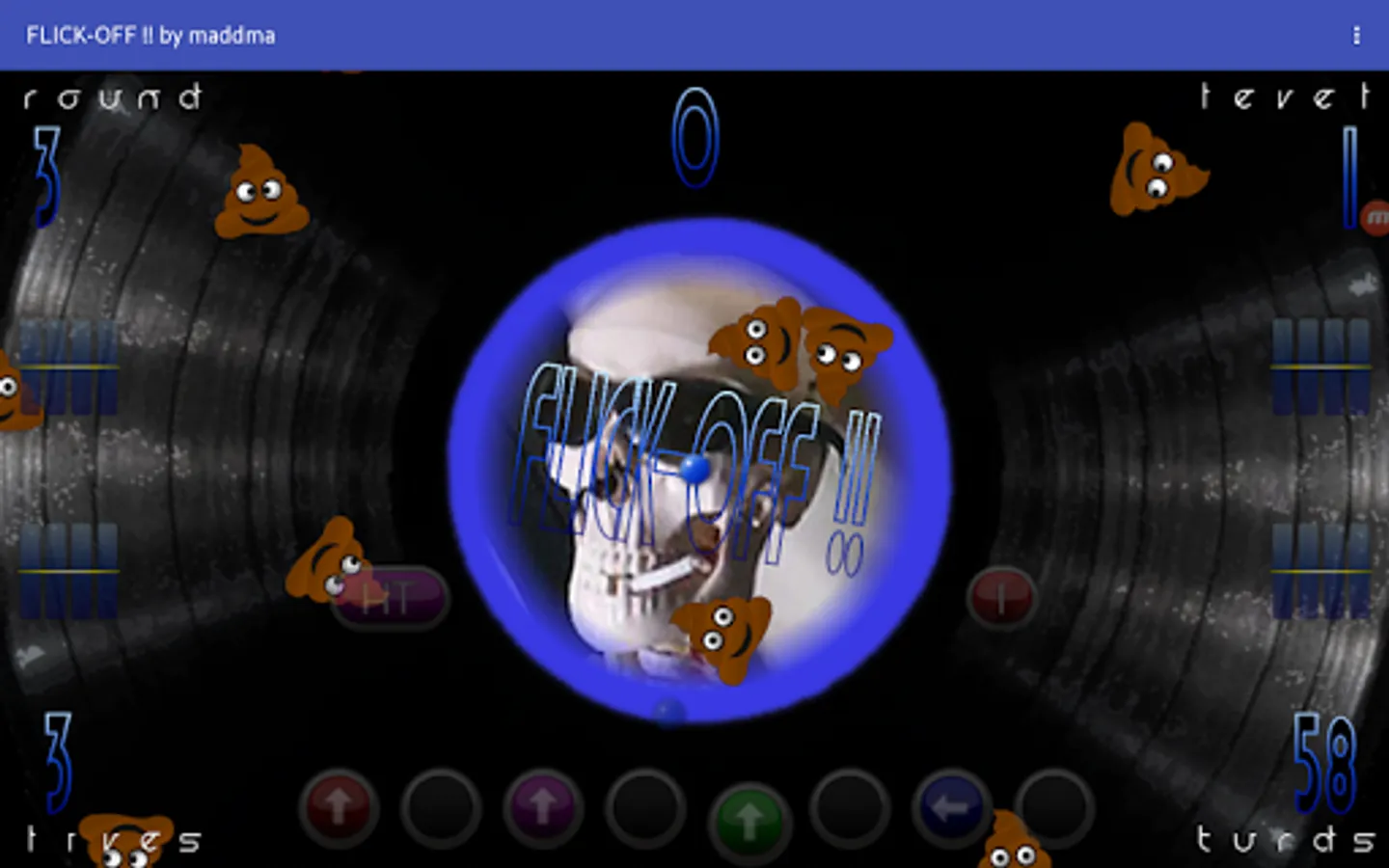 And "TURD-TOSSING": toss your accumulated Turds at your opponent's screen, during the two-player game when it is not your round, to try and put them off their flicking! Just tap at the relevant place on your own screen. (Also functions during the title screen, for free!)