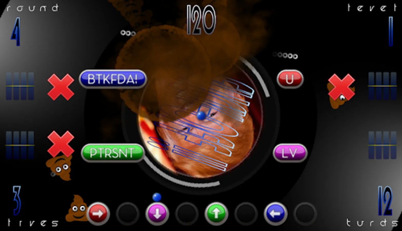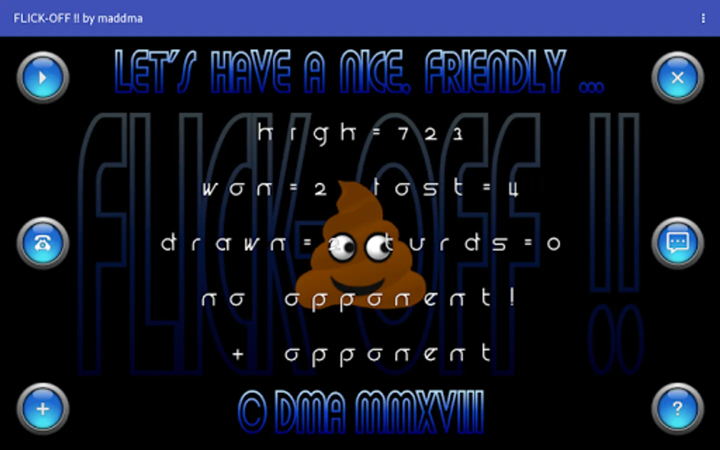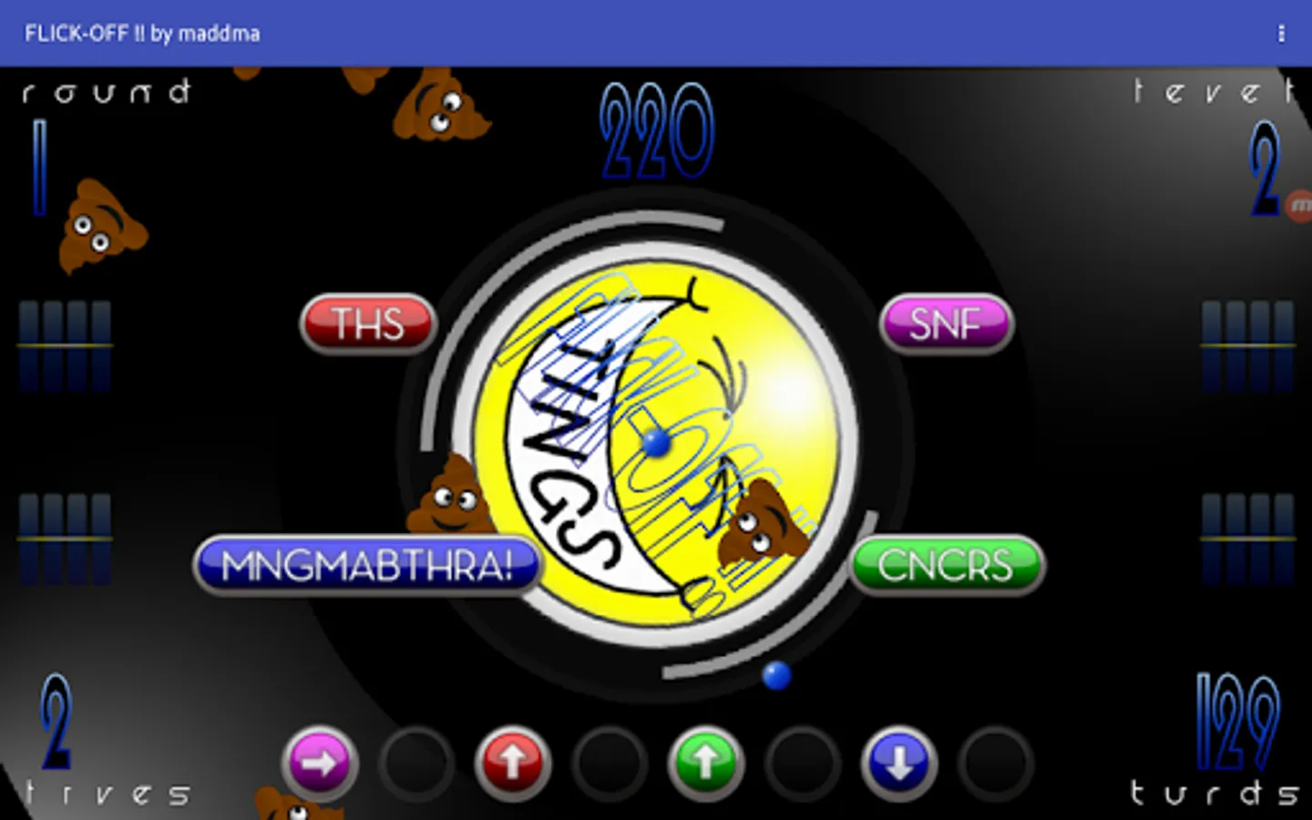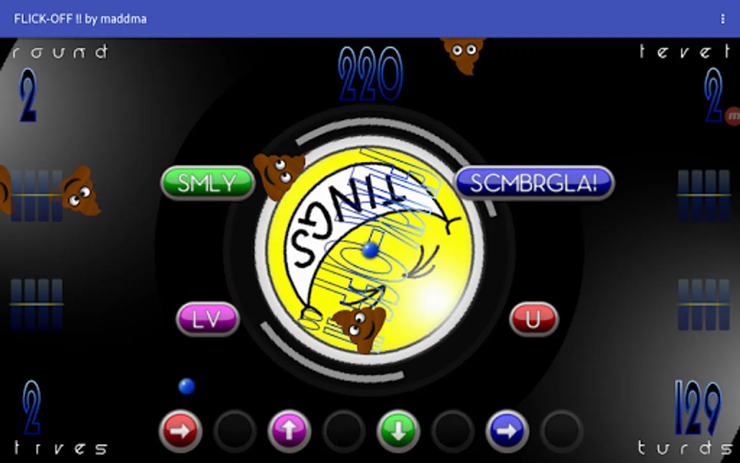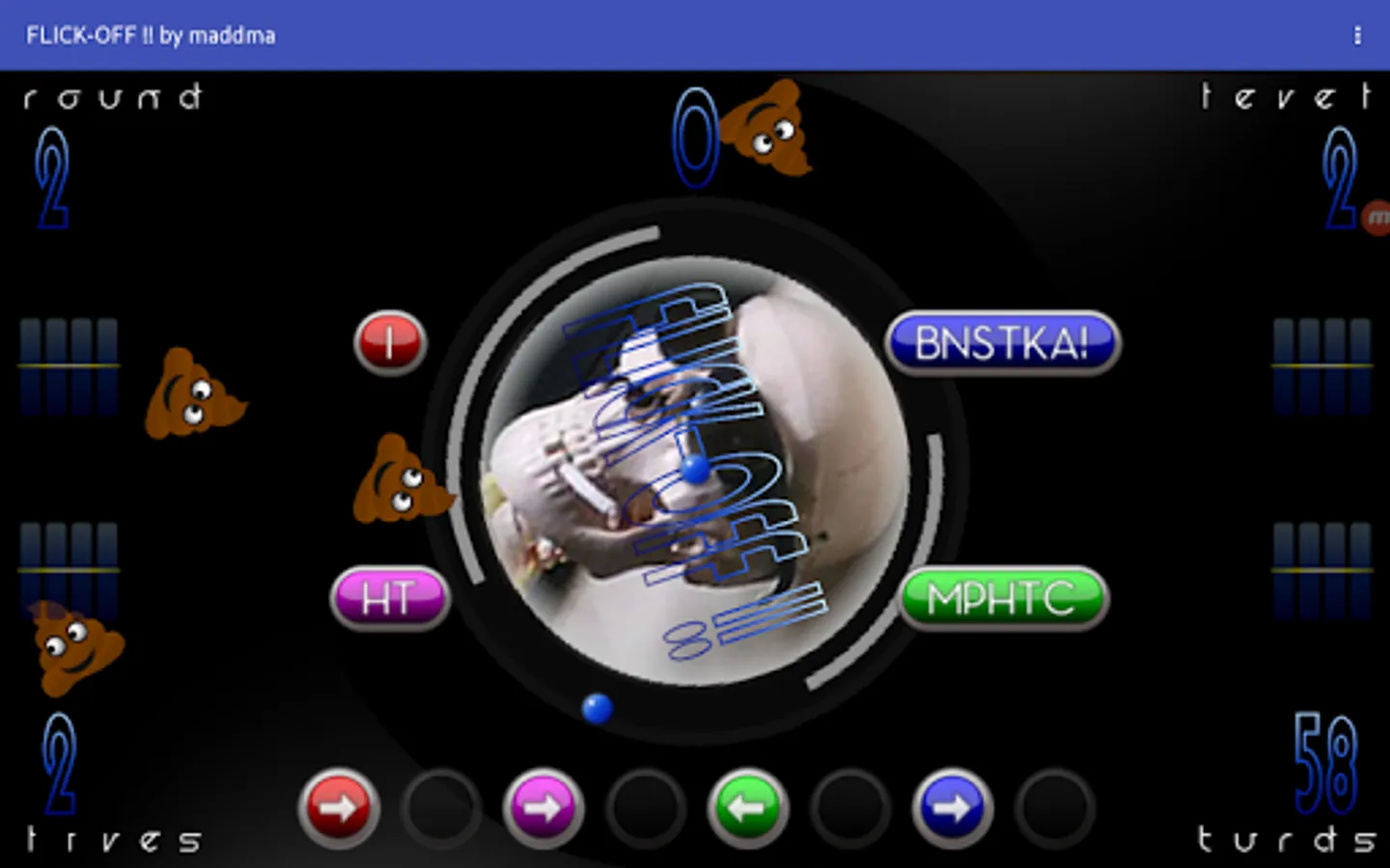 And "TURD-TOSSING": toss your accumulated Turds at your opponent's screen, during the two-player game when it is not your round, to try and put them off their flicking! Just tap at the relevant place on your own screen. (Also functions during the title screen, for free!)