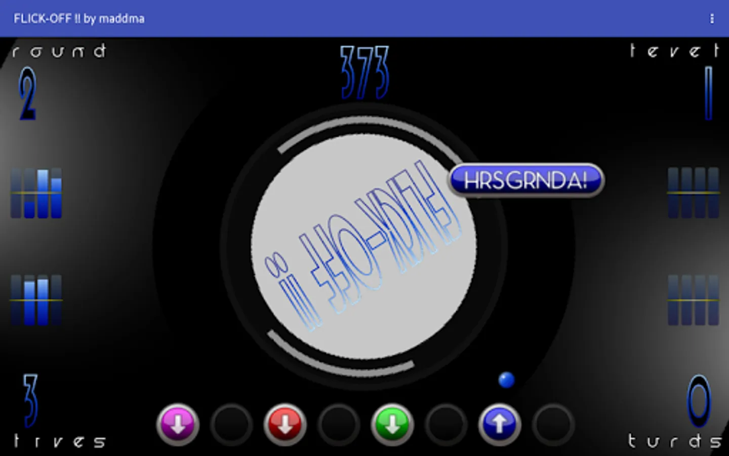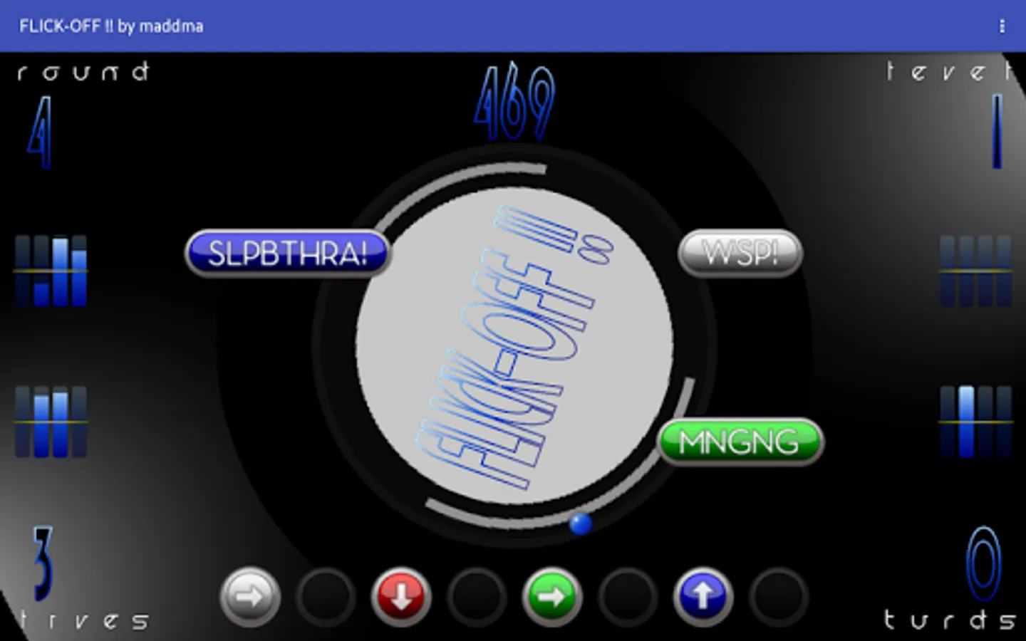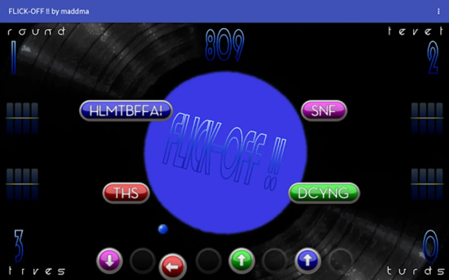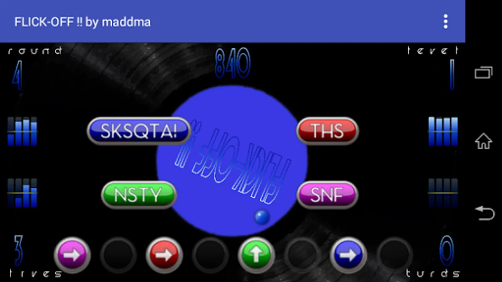 Your accuracy is shown by the bars at the screen sides, each having a line showing the minimum requirement. There are four rounds in each level, and if you fail to FLICK-OFF adequately, on average, at the end of the level you will lose a life. There are thirty levels, and the required flicking speed and accuracy gradually increases.