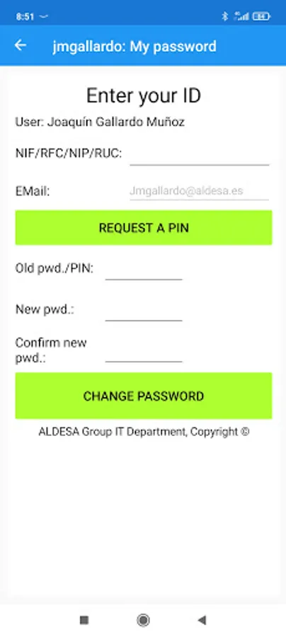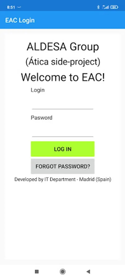 Password integrated with the EAC and secure access through https protocol, authentication by token assigned by server and in each action a review of authorizations per company and work is executed according to the configured profile of the user.