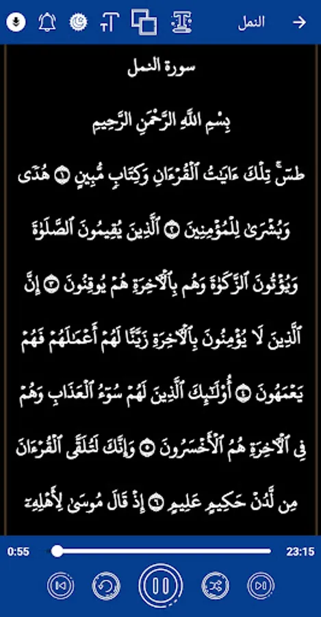By pressing the (Next Surah) and (Previous Surah) button, you can listen to the previous surahs of the surah you are listening to, as well as the following surahs. The program also shows you the duration of each surah so that you are aware of this.