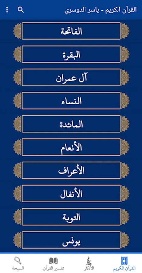 As we mentioned, the interface of the Noble Qur’an application, audio and video of Yasser Al-Dosari, is a simple interface that enables users, young or old, to listen to the Noble Qur’an and use the application with ease away from complexity.