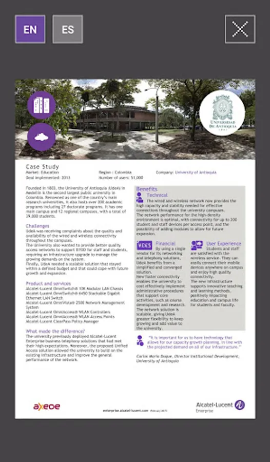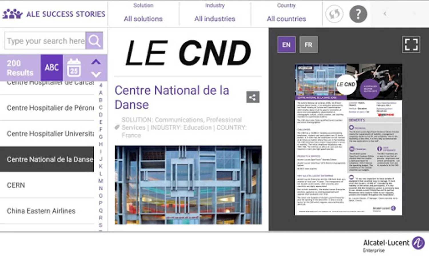 This application enables any user to access ALE International customer reference list, related case studies and videos, sort the assets by country, industry, solution, and publication date