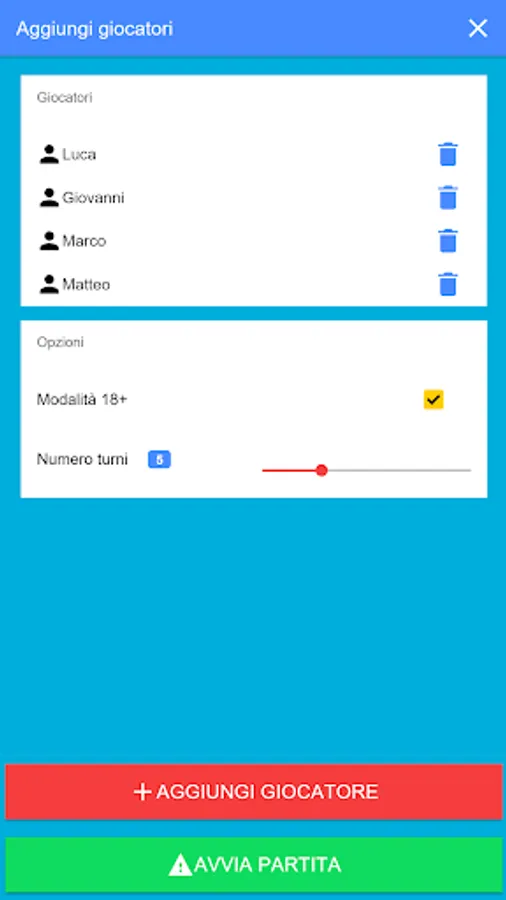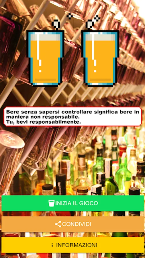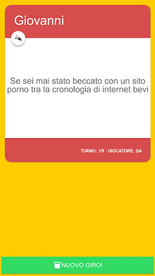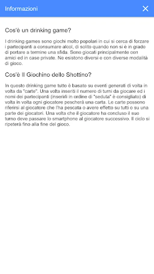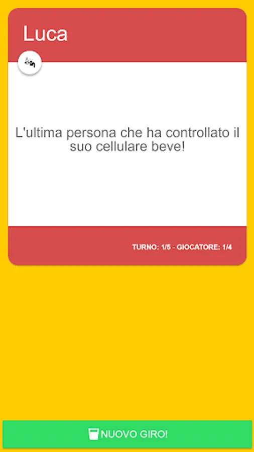 In this drinking game everything is based on events generated from time to time as "cards" (we have more than 200!). Once you have entered the number of rounds to play and the names of the participants (place them in order of "sitting" it is recommended) from time to time each player draws one card. The cards may refer to the player who has drawn or have an effect on all or part of the players. Once the player has completed his turn must pass the smartphone to the next player. The cycle will repeat until the end of the game.
