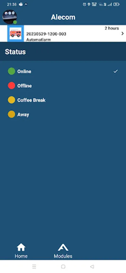 Changing User status. Offline Users will not be allowed to receive alarms.