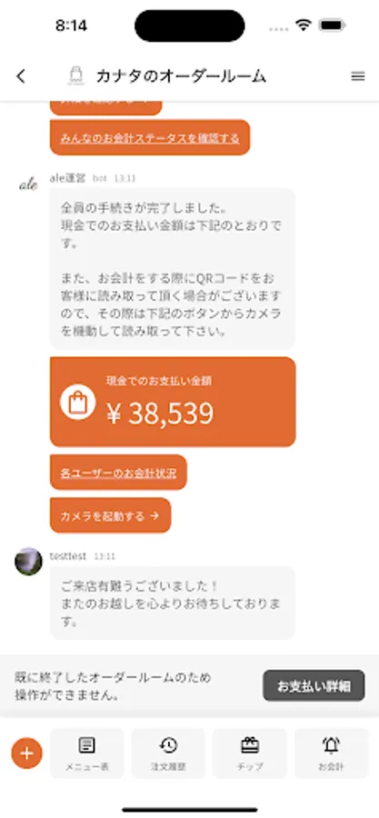 Furthermore, ``ale'' has a wide selection of payment methods. You can choose the payment method that suits you, including credit cards, debit cards, and electronic money. And I will never forget to express my gratitude for your service. You can also tip your staff easily from the app.