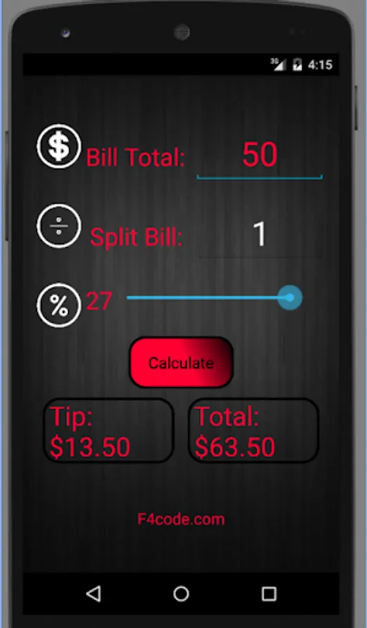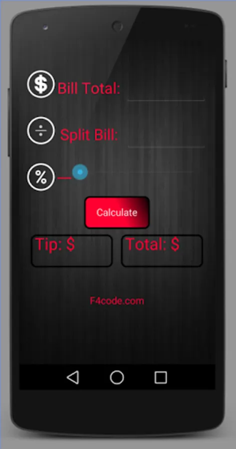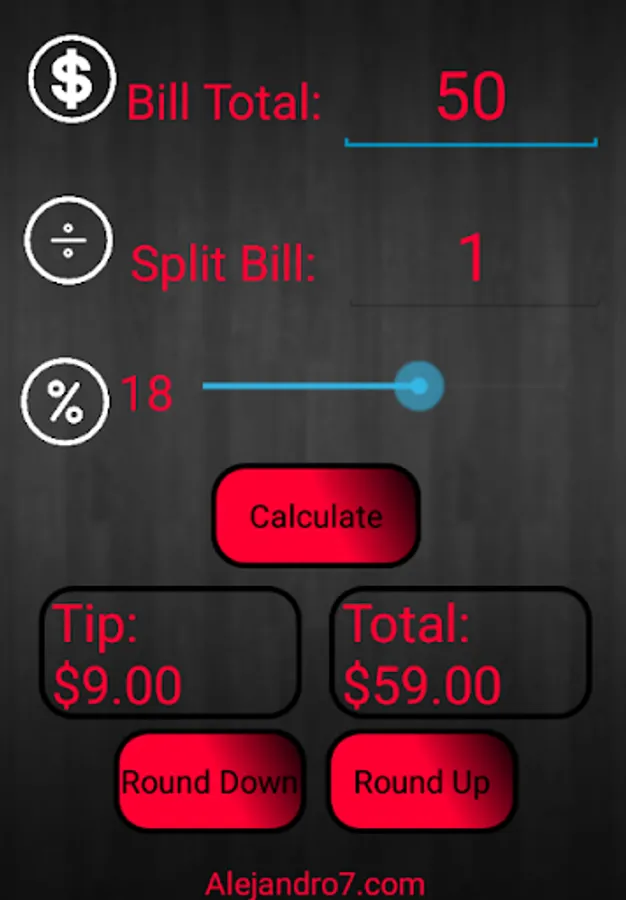 This tip calculator app not only calculates tip quickly and easily but also helps to split the bill between any number of people. Round up or round down on any value on the tip calculator. See changes to the tip percentage, tip amount, total amount and amount payable per person immediately!