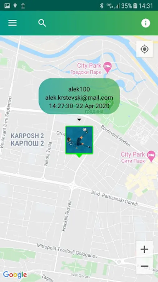 Ќе се појави и син маркер доколку последната локација добиена од GPS провајдерот е во опсегот на црвениот круг со тоа е поголема веројаноста корисникот да биде околу тој син маркер.