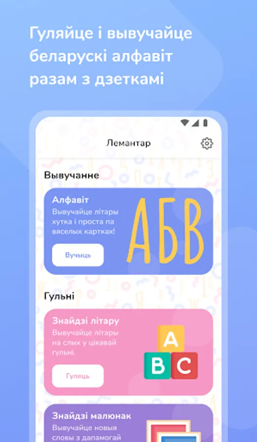 З дапамогай "Лемантара" ваша дзіця хутка вывучыць літары беларускага алфавіта і зробіць першыя крокі да навучання чытанню. Мы ўлічылі ўсе асаблівасці беларускай мовы (дзеці пазнаёмяцца з дыграфамі дж і дз, а таксама апострафам; ёсць магчымасць вывучыць беларускую лацінку).