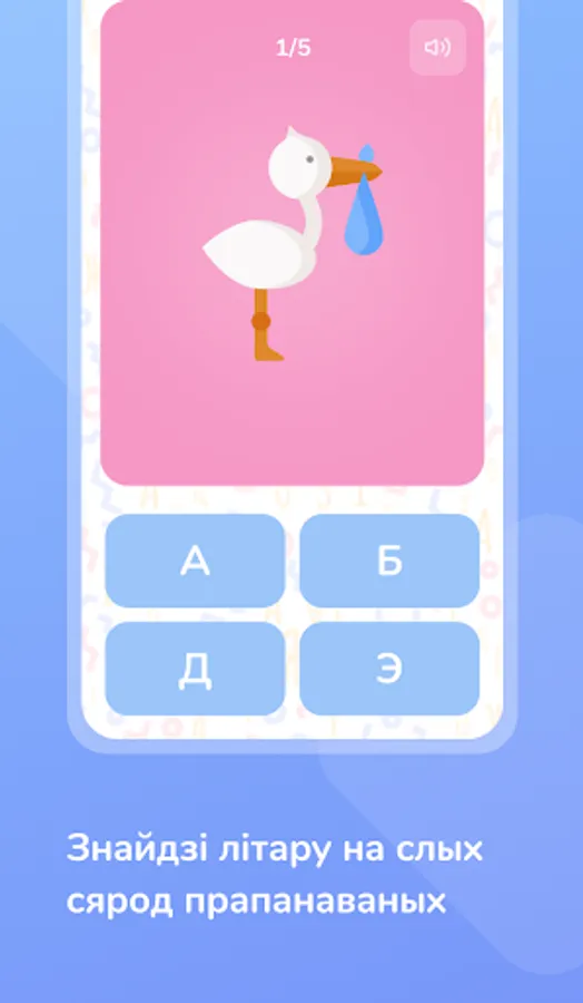 У першым - кожнай літары алфавіта адпавядае яе вымаўленне, яе назва і малюнак. Адразу ўводзяцца выявы вялікіх і маленькіх літар, каб дзеці ведалі, што А і а - гэта адна і тая ж літара. Мы лічым вельмі важным вывучаць не толькі назвы літар, але і тое, як яны вымаўляюцца (гэта важна для навучання складоваму чытанню). Карыстальнікі могуць выбіраць у наладках, што канкрэтна вывучаецца ў пэўны момант.