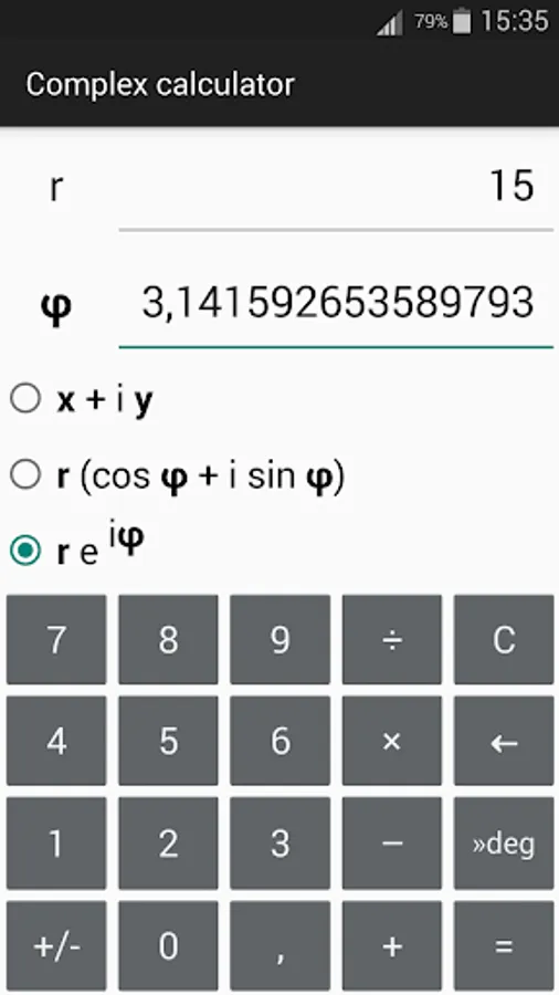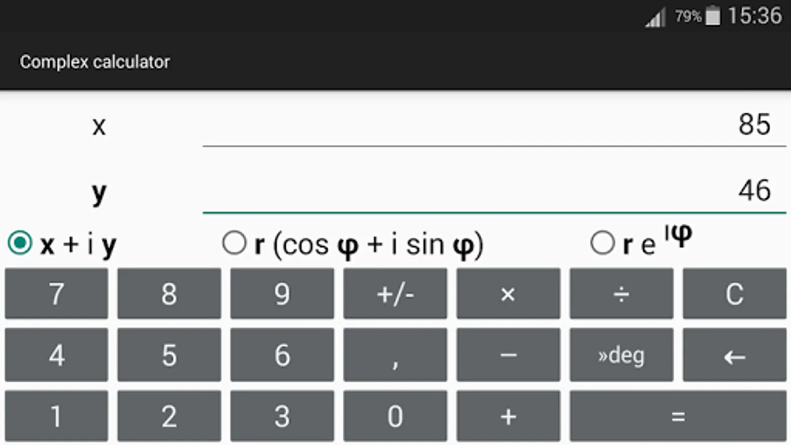 Simple and convenient calculator for complex numbers. Numbers can be entered in any form: algebraic (x + iy), trigonometric (r (cos φ + i sin φ)), or exponential (re^iφ). The calculator can translate complex numbers from one form to another. The angle φ can be set in degrees or radians. When calculating a single expression, you can enter complex numbers in different forms.