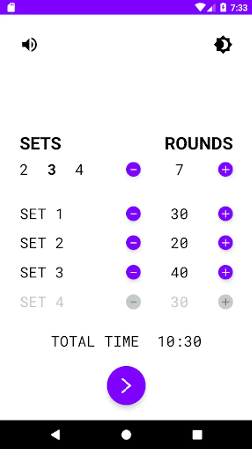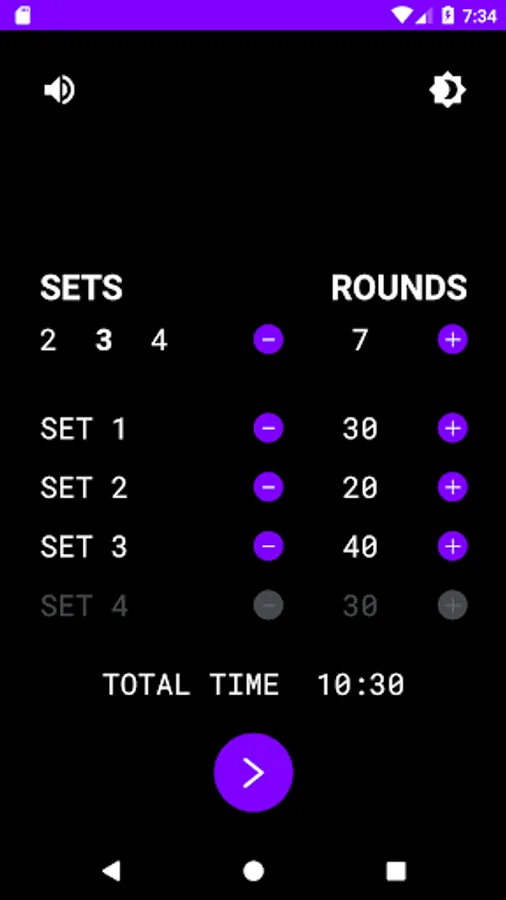 Customize your interval training sessions. Easy to select the amount of sets and rounds. Specify the desired time for your HIIT training and hit the start button!