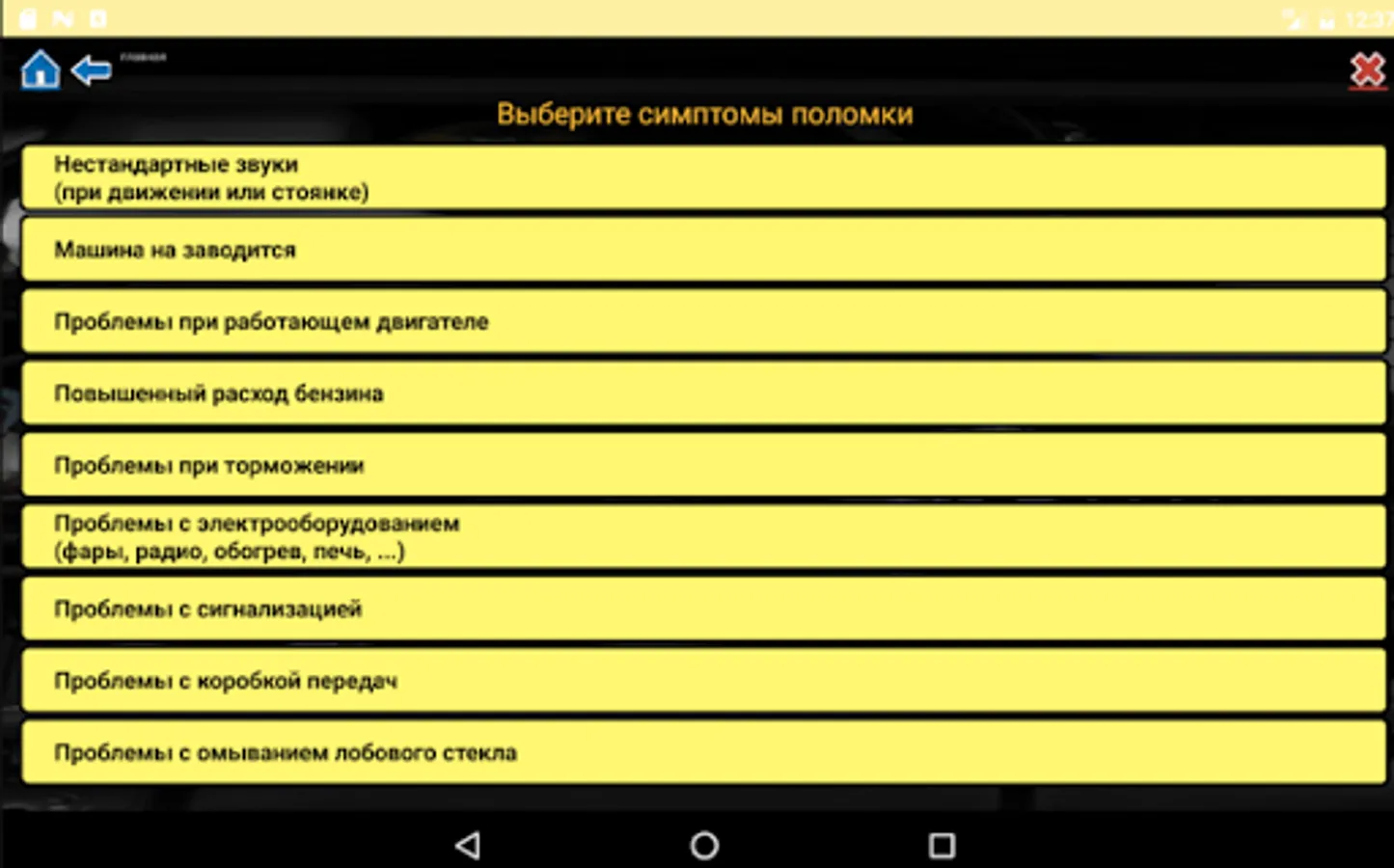 For example, you began to feel a problem under braking your car - the car was a sidetrack ... To understand the possible reasons for this failure and to evaluate the complexity of the repair machine choose the option "problems under braking," etc. "When braking the car withdraws aside" and you will be offered the possible causes damage to the machine. At least you'll be ready to repair your car, know the possible causes of failure. Agree, a preliminary diagnosis of the machine by symptoms in one app - pretty handy thing.
