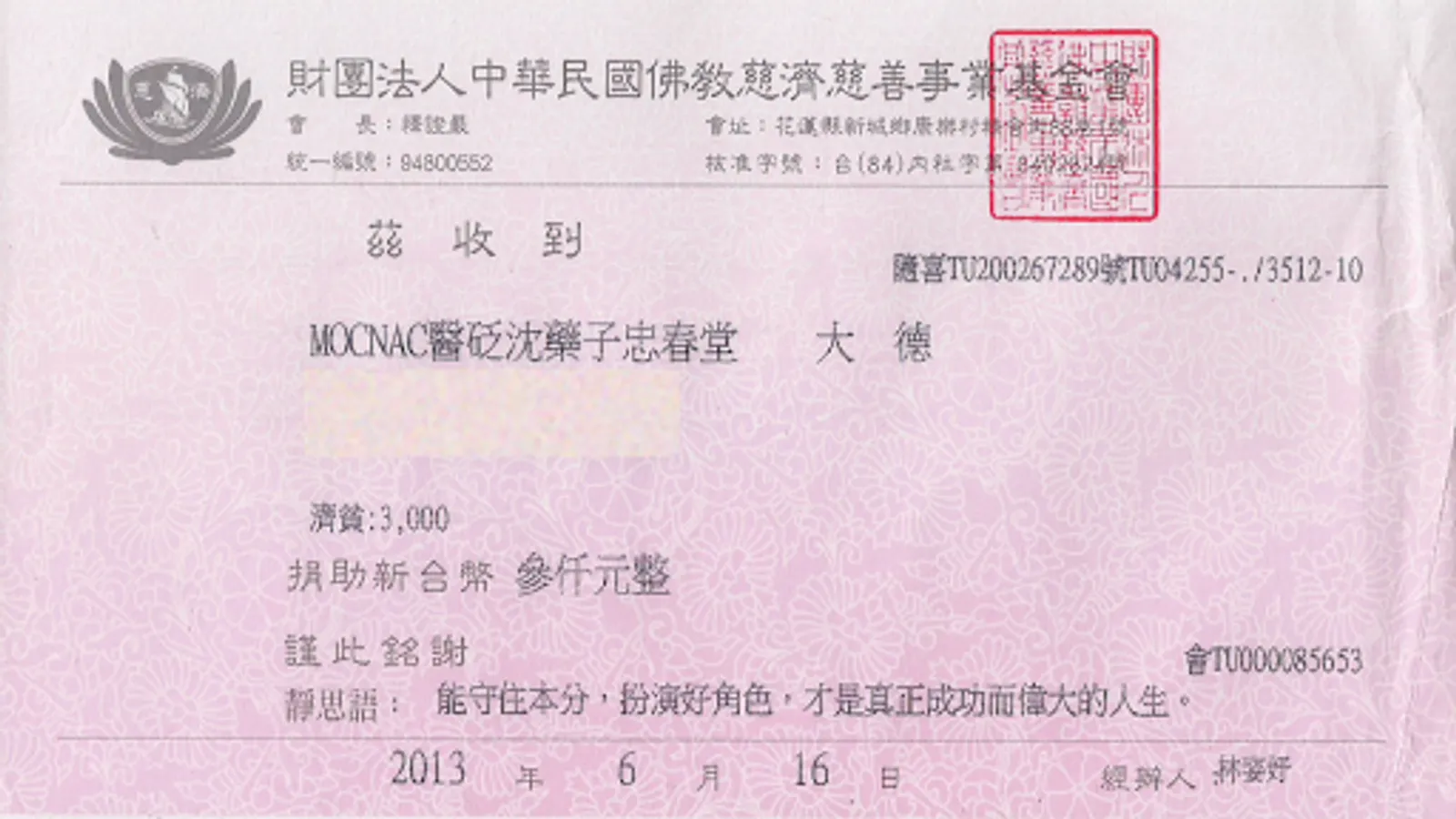中醫生活和忠春堂的廣告收入與其他APP的收入已達到US100,忠春堂與Mocnac已將其善款捐出給財團法人中華民國佛教慈濟慈善事業基金會,謝謝各方大德的善心,讓需要幫助的人感受到溫暖。忠春堂與Mocnac今後仍然會繼續為社會盡一份心力,所以懇請各方大德繼續支持,希望能繼續換取善款並將善款捐到慈善機構。